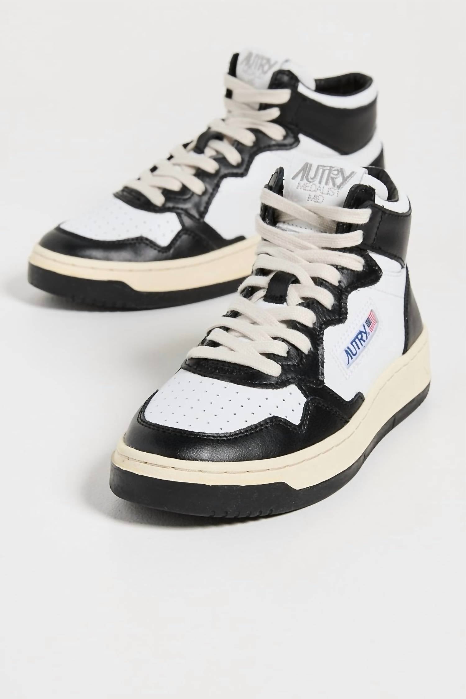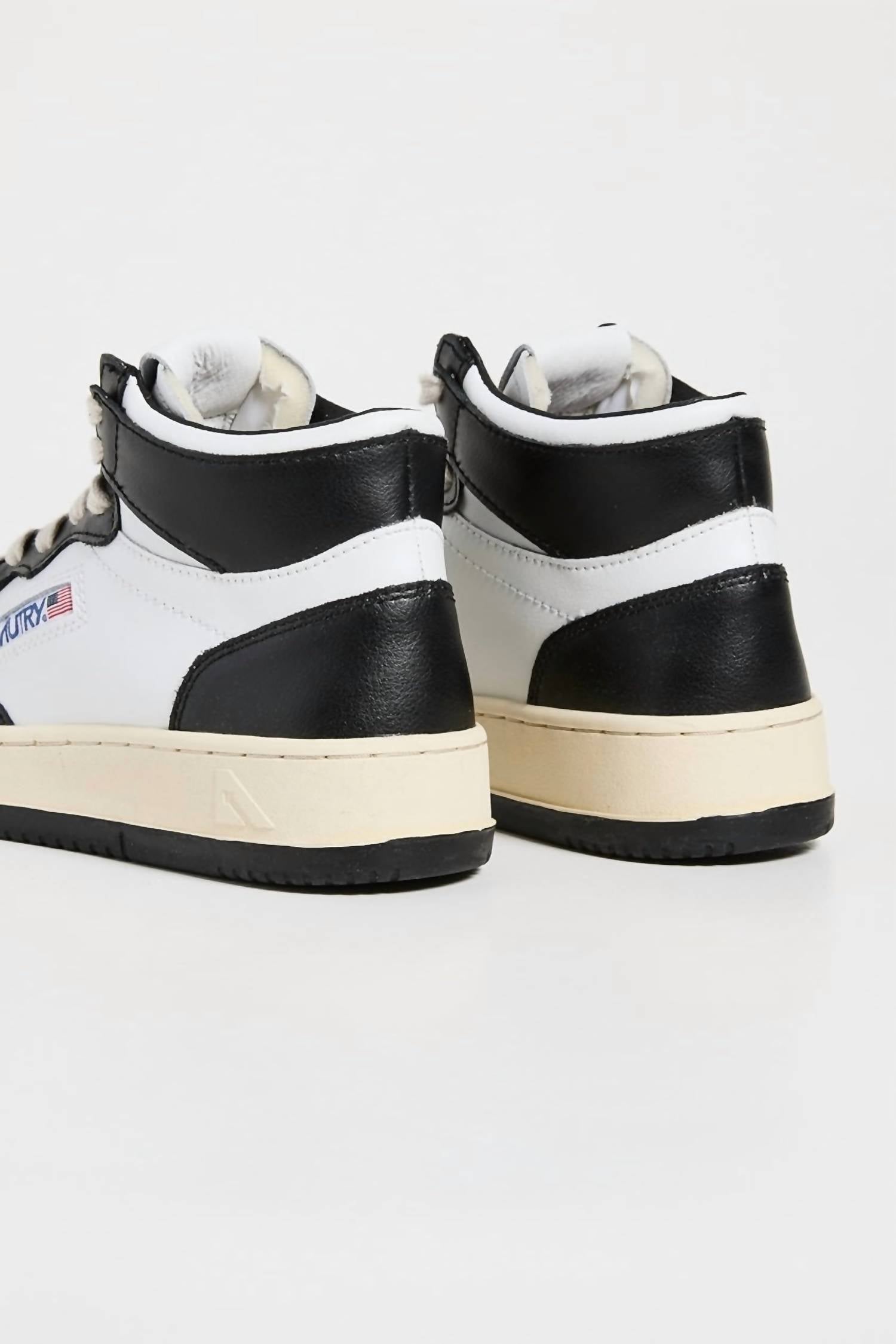 Cute, functional, and comfortable. These sneakers check all the boxes. Introducing the Women's Medalist Mid Sneaker by AUTRY, a perfect blend of style and comfort. Crafted with a minimalist design, this sneaker features a round toe and a flat heel, ideal for a trendy spring dinner party outfit. In a chic white and black color scheme, it effortlessly complements any ensemble. The absence of a closure type enhances its sleek look, making it a versatile addition to your footwear collection.