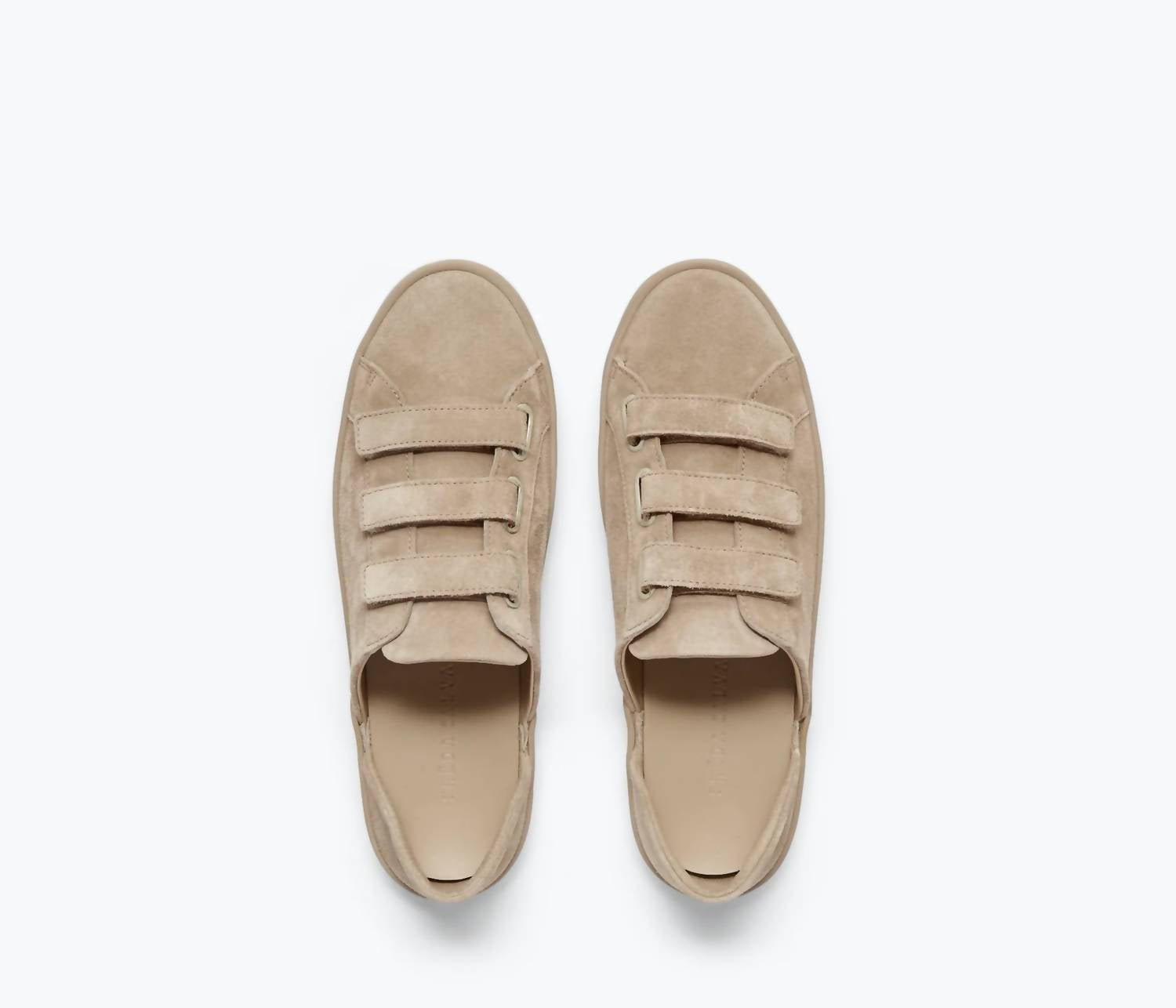 When fashion and function come together seamlessly. Step into minimalistic elegance with the Women's Libby D'orsay Sneaker by FREDA SALVADOR, crafted in soft stucco suede for ultimate comfort and style. Featuring a clean three-strap closure and iconic cutout design, these sneakers boast a flat heel and round toe, making them perfect for summer vacations or casual Thanksgiving outings. The thick vulcanized rubber sole ensures all-day comfort, while the medium width accommodates most feet, fitting true to size. Please remember, there might be a break-in period; we suggest wearing them with socks initially.