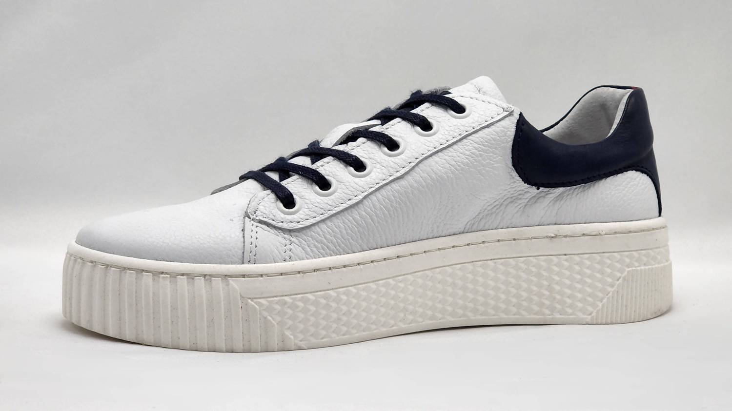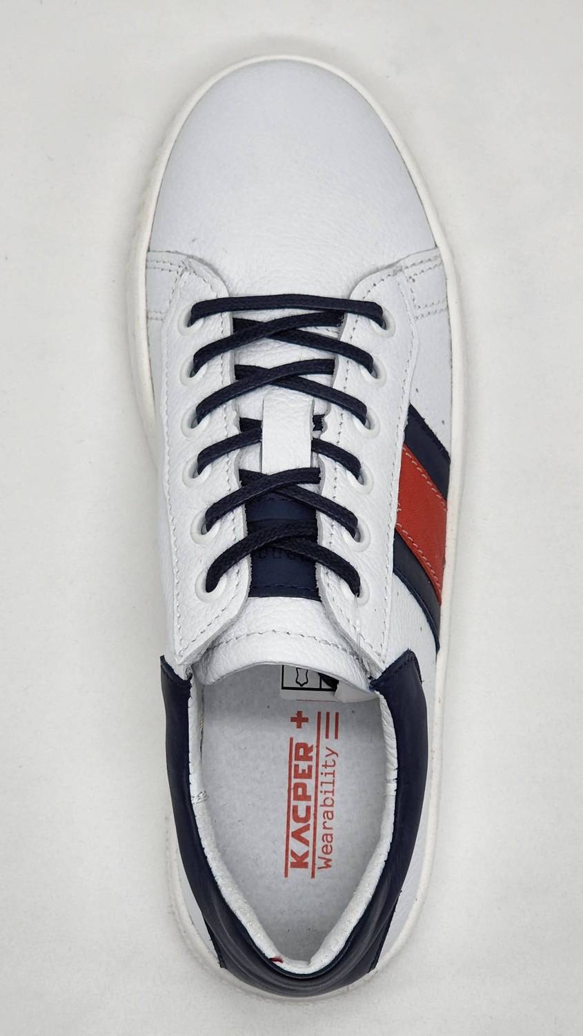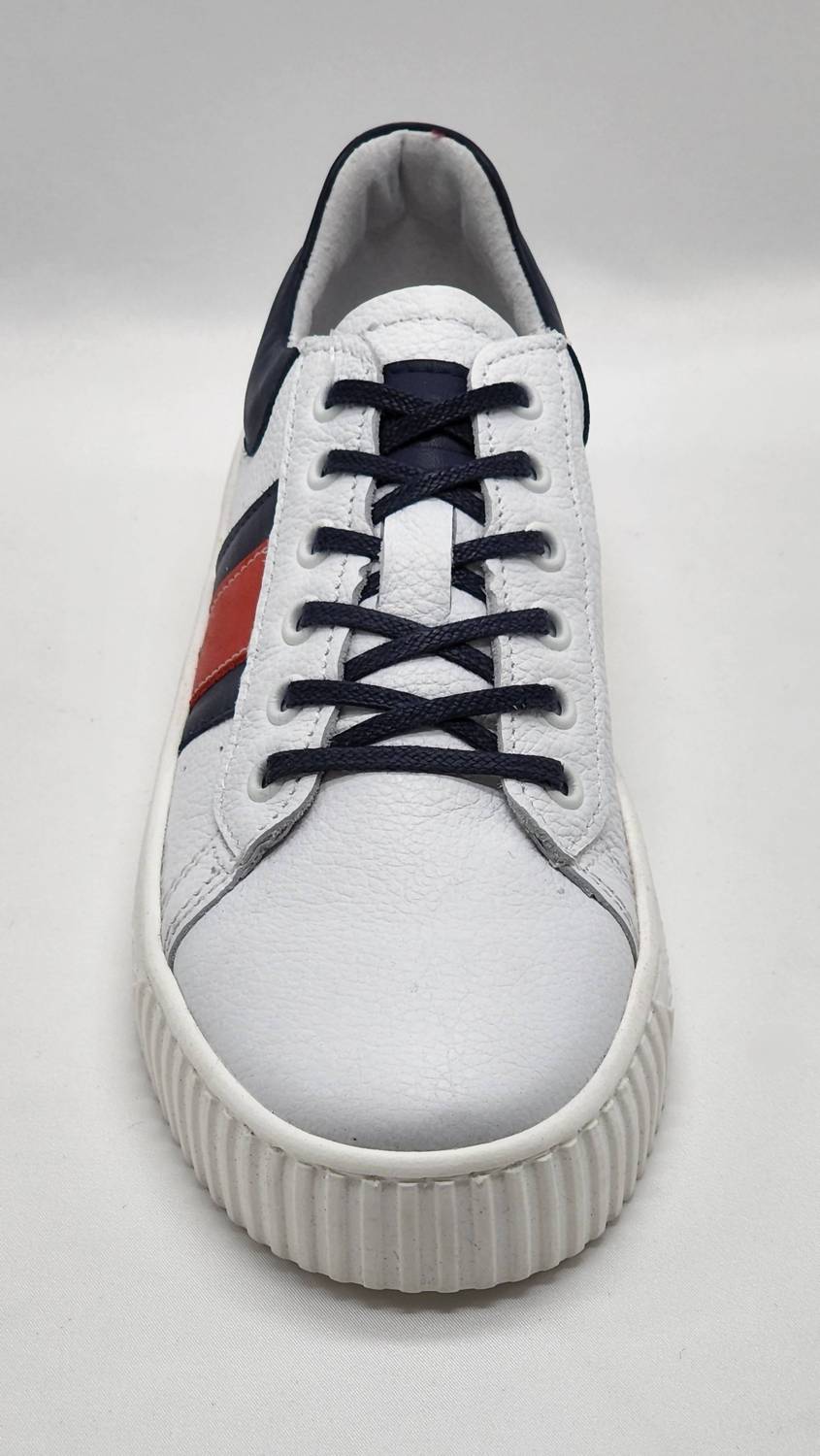 White color with red and navy blue accents. Classic sneaker line. Casual style. Made from natural leather. Handcrafted in Poland. Very lightweight. Designed for all-day comfort and wearability. Runs true to size.