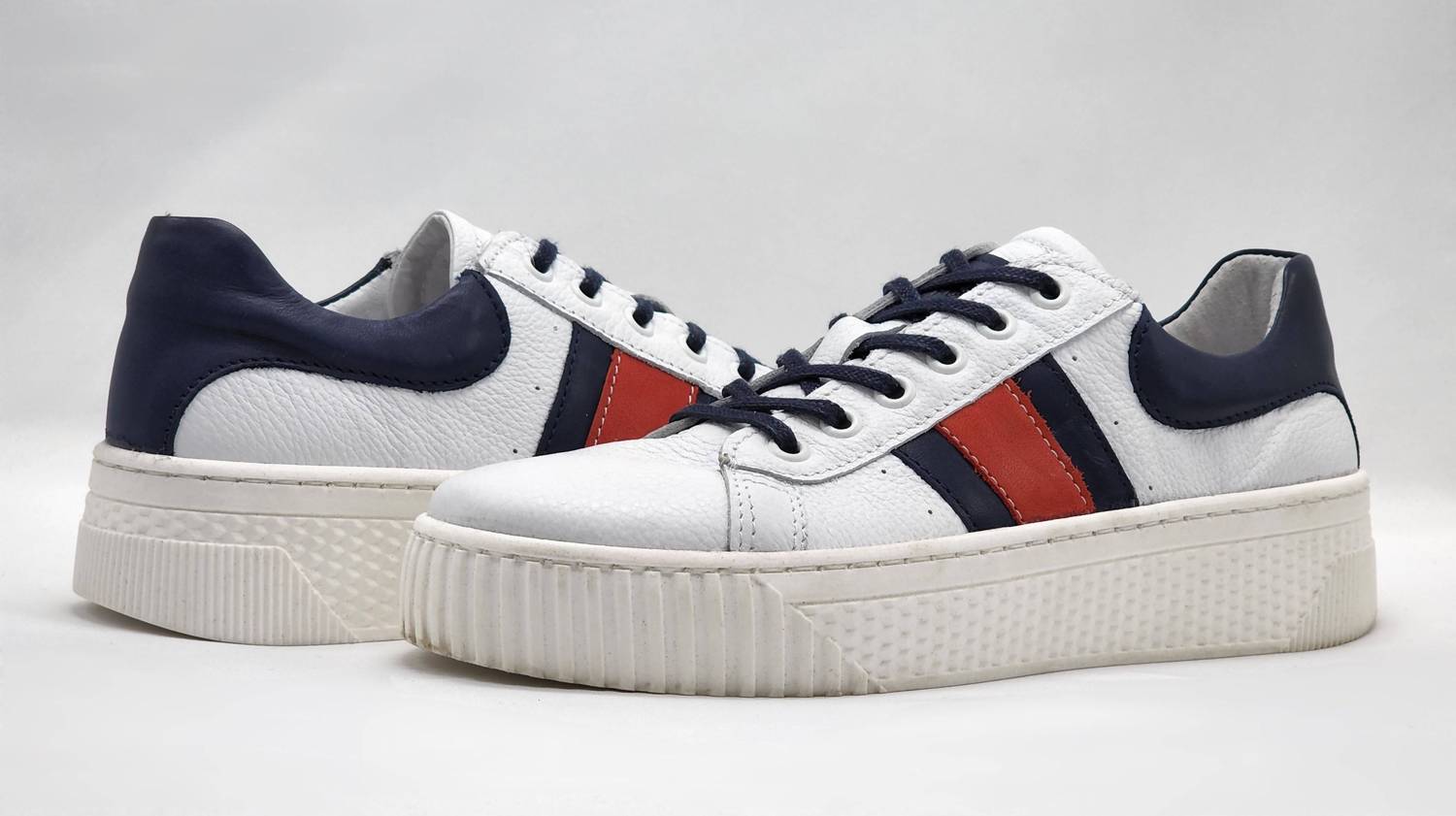 Cute, functional, and comfortable. These sneakers check all the boxes. White color with red and navy blue accents. Classic sneaker line. Casual style. Made from natural leather. Handcrafted in Poland. Very lightweight. Designed for all-day comfort and wearability. Runs true to size.