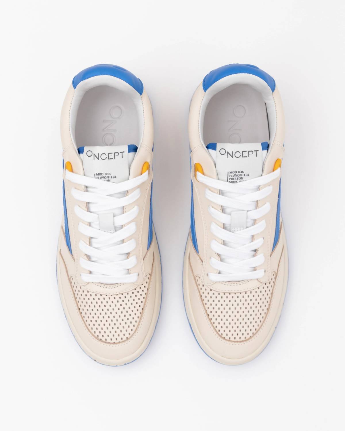 Cute, functional, and comfortable. These sneakers check all the boxes. Step into nostalgia with the Women's Preston Sneakers by Oncept, designed to bring 90s fashion to contemporary travel. Featuring a soft calf leather upper and a round toe, these blue sneakers offer both comfort and style. With an environmentally-friendly Tencel pulp based twill lining and a bio-density molded footbed made from recycled materials, they align with Oncept's commitment to sustainable fashion. Perfect for spring getaways and 4th of July celebrations, the Preston Sneakers provide a flat heel and re-speckled bottom for all-day comfort and flair.