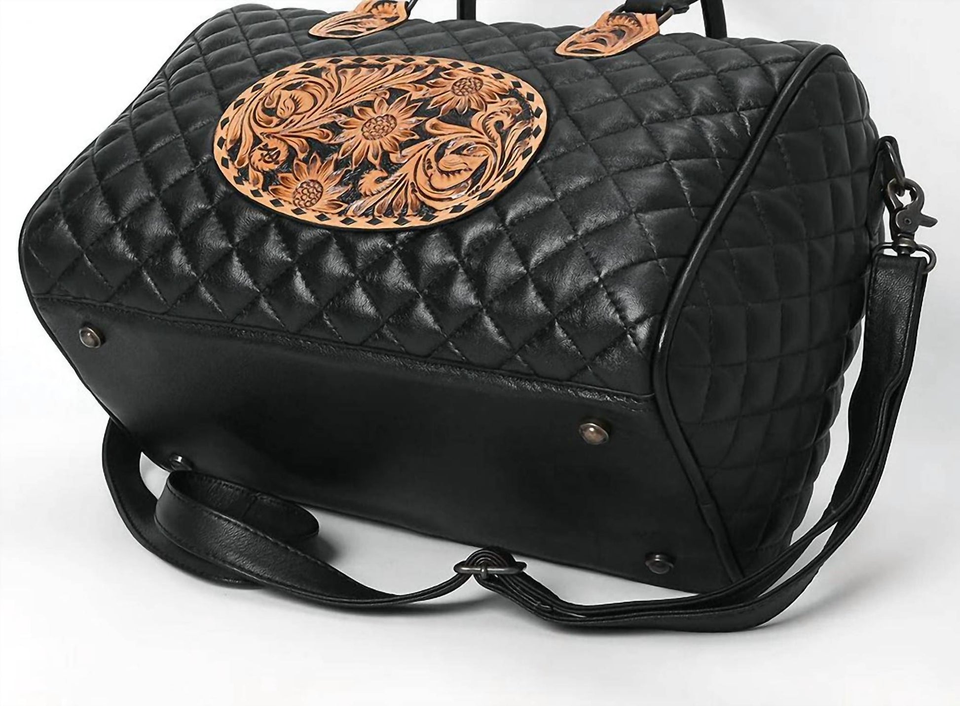 Experience timeless elegance with the Women's Bonnie Speedy Quilted Purse by American Darling, a luxurious black crossbody bag. Crafted from authentic full grain leather, it promises durability and a rich patina over time. The purse features an adjustable suede strap for comfort and a robust YKK zipper for secure closure. Finished with solid antique metal fittings, it combines style and functionality seamlessly.