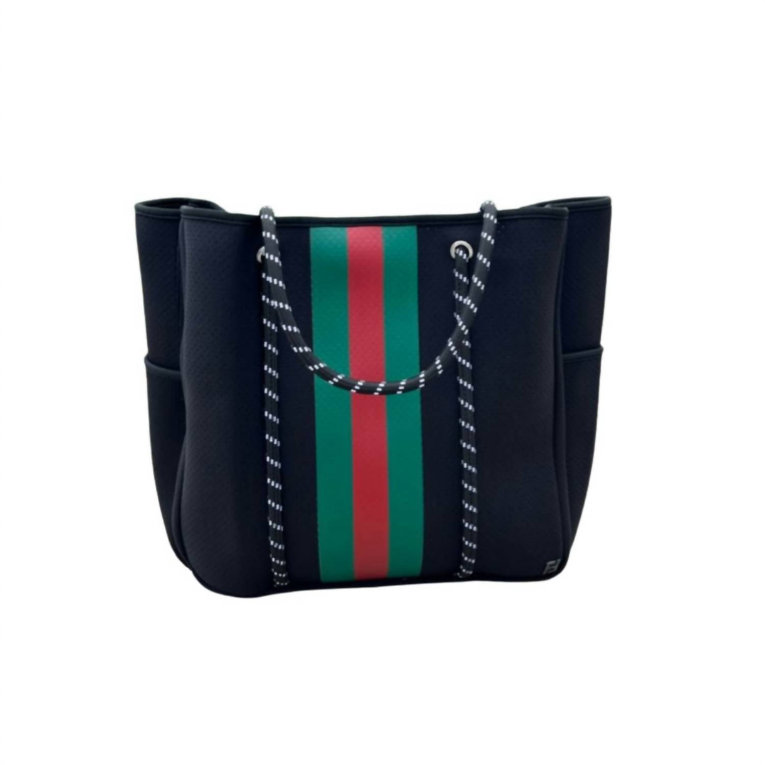 Introducing the Women Courtside Small Pickleball Paddle Tote Bag by Five Love, a chic and practical tote in black with striking red and green stripes. This tote is crafted from durable, water-resistant neoprene and measures 13" L x 12" H x 7" W, providing ample space for your pickleball essentials. Designed with both interior and exterior pockets, it can securely hold up to two paddles along with additional gear, ensuring you're organized whether on the court or on-the-go. Equipped with padded rope straps, this bag offers comfortable carrying for all your daily or sports necessities.