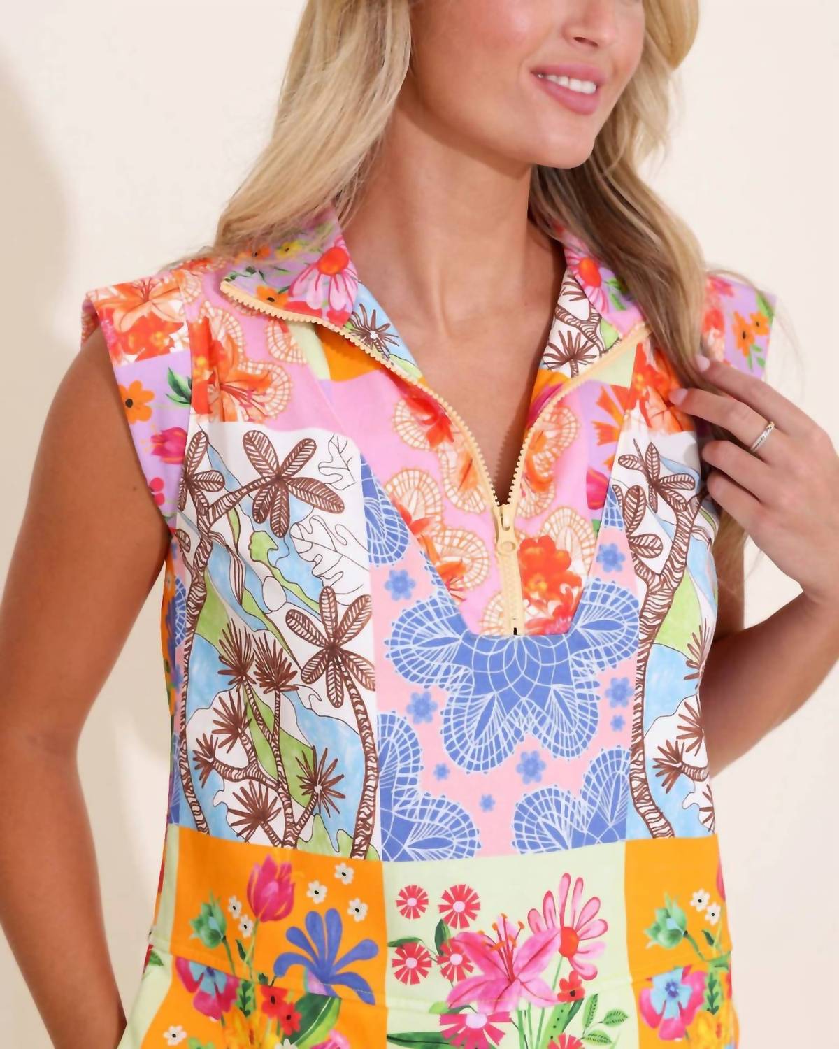 Elevate your summer wardrobe with the Women's Clara Top by Alden Adair, perfect for a boho chic beach day. This sleeveless blouse features a charming floral sketch pattern in a breezy cotton blend for ultimate comfort. It comes with a chic collar neckline and a discreet zip closure.