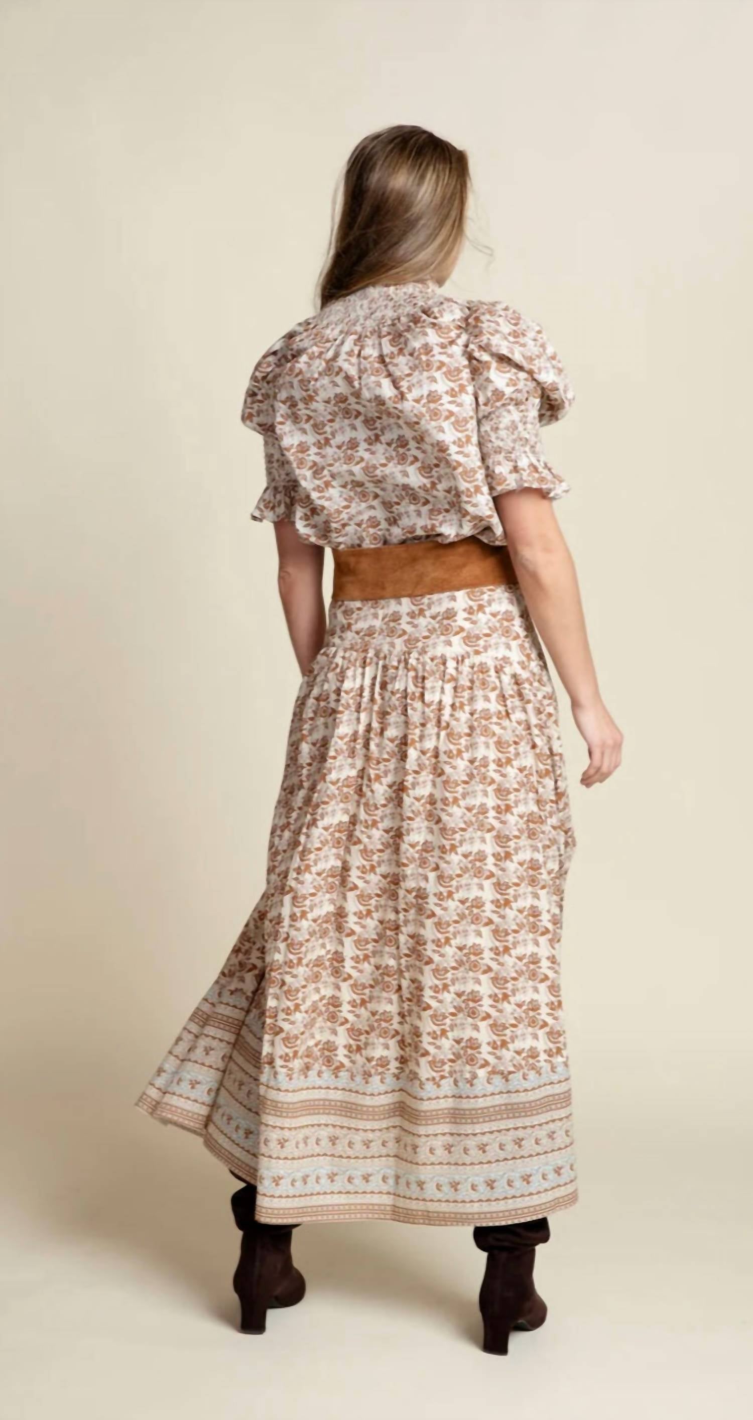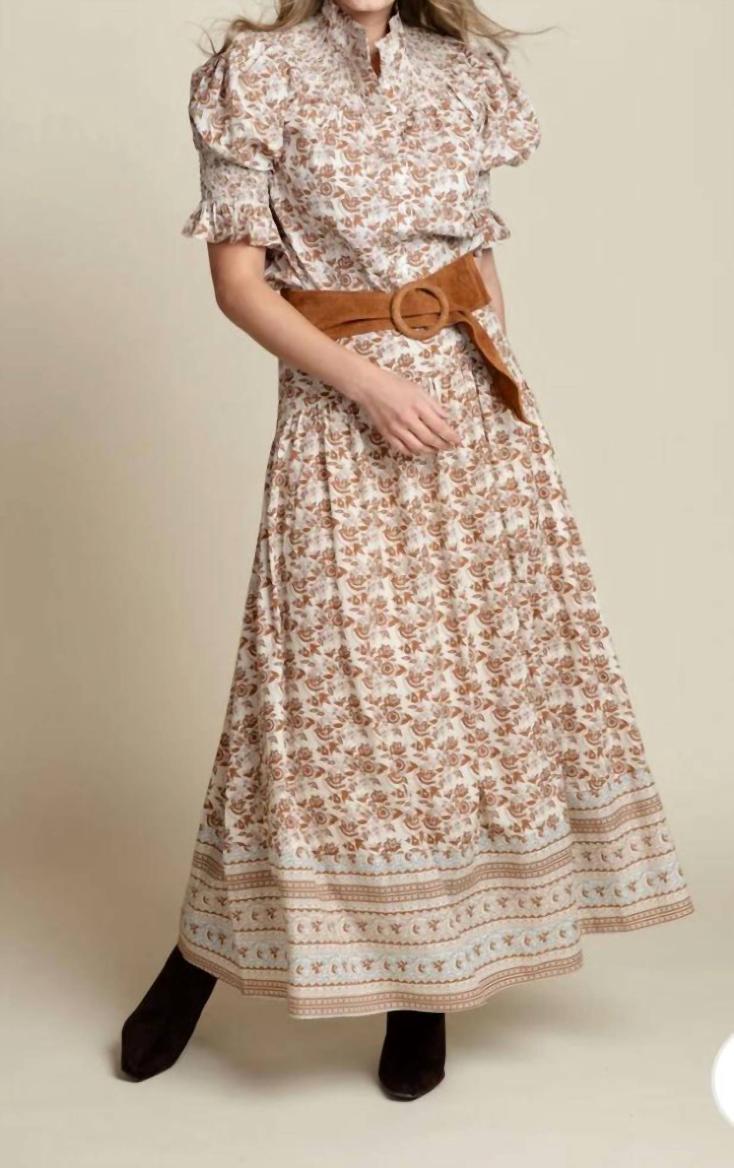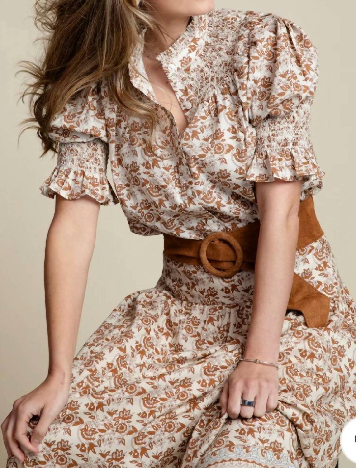 Discover the Sammy Cotton Voile Shirt by Burgess Sweaters, a delightful floral blouse in a sophisticated mocha print. This women's garment features short elasticized puff sleeves and a detailed collar, making it a perfect fit for vintage-inspired ensembles. Made from 100% cotton voile, it offers a breathable, lightweight feel and is completed with a classic button closure. Origin unknown. Care for it with ease by machine washing.