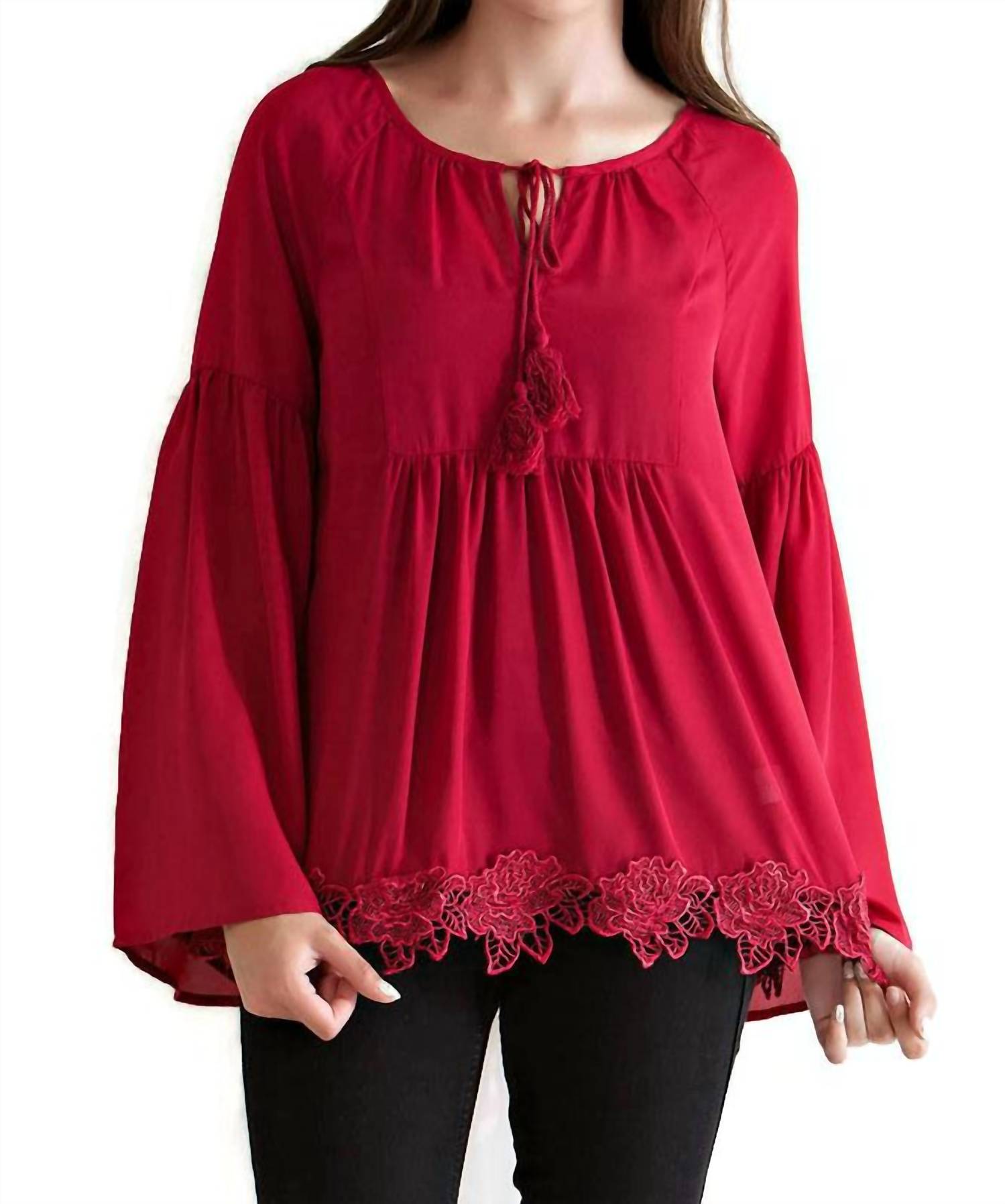 Elevate your bohemian style with the Entro Lace, Bell & Tassel Tunic Top in a vibrant red hue. This textured blouse features long bell sleeves, a split V-neckline with tassel ties, and delicate lace on the hemline. Crafted from 100% lightweight polyester, this semi-sheer woven fabric ensures both comfort and a touch of elegance. Available in sizes Small, Medium, and Large with a consistent length of 27 inches, this tunic top offers a breezy silhouette perfect for warm weather dressing.