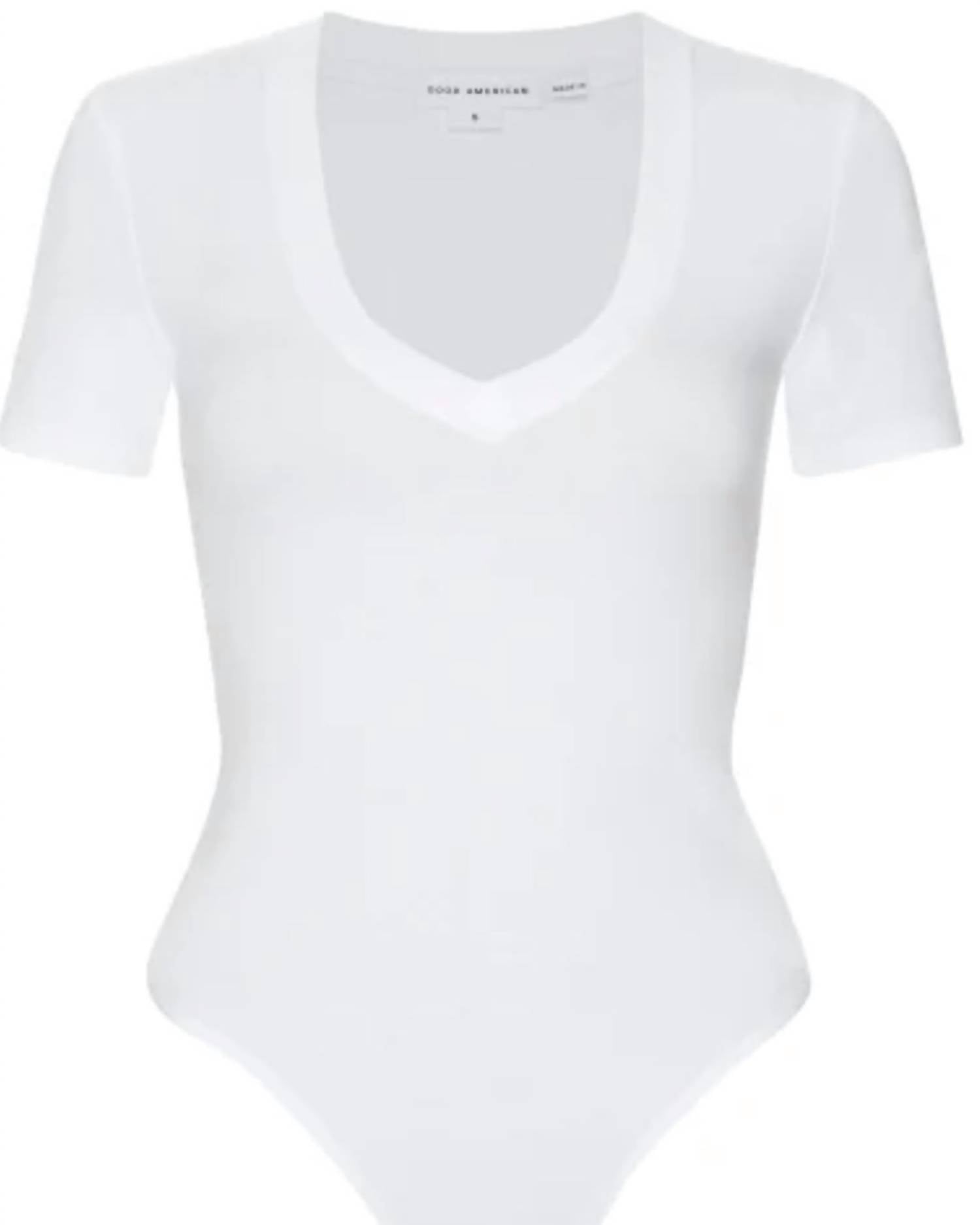 Form fitting and comfortable - this bodysuit check all of the boxes. Meet the Women's Super Stretch Deep V-neck Bodysuit by Good American, a must-have for bodysuit enthusiasts. This white, short sleeve bodysuit features a deep V-neckline, crafted from a comfortable and stretchy cotton blend. Composition: 94% Cotton, 6% Spandex. Care: Machine wash and tumble dry for effortless maintenance. Ideal for spring vacations and minimalist wardrobes.