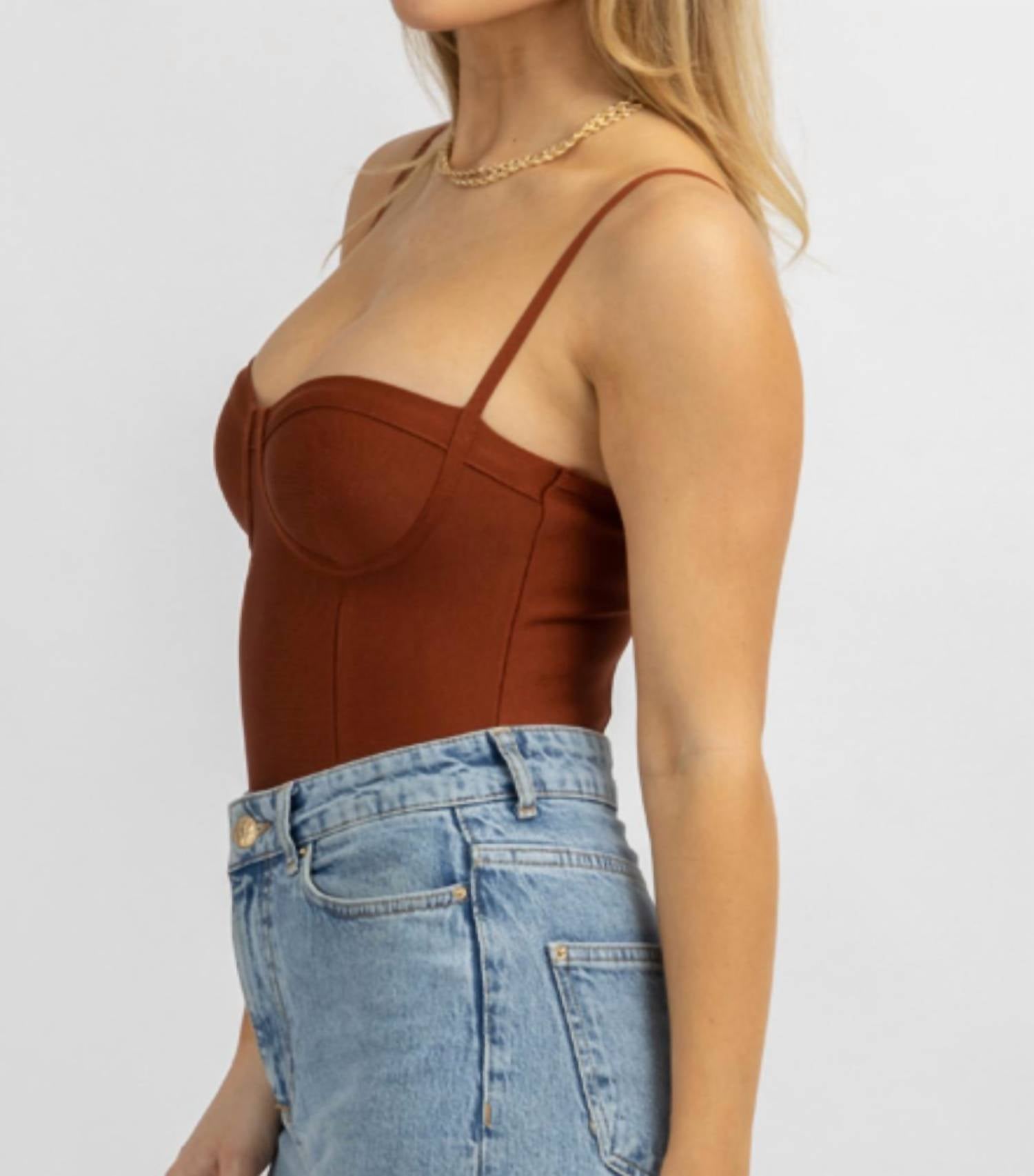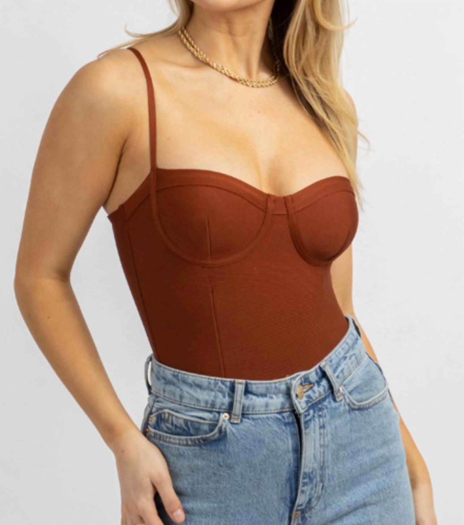 Form fitting and comfortable - this bodysuit check all of the boxes.90% Polyester, 10% Spandex. Stretch with form fitting hold, Bustier detail, Spaghetti straps, Sleeveless, Snap closure. Charley is wearing a size small. Height | 5'8. Dress size | 2.