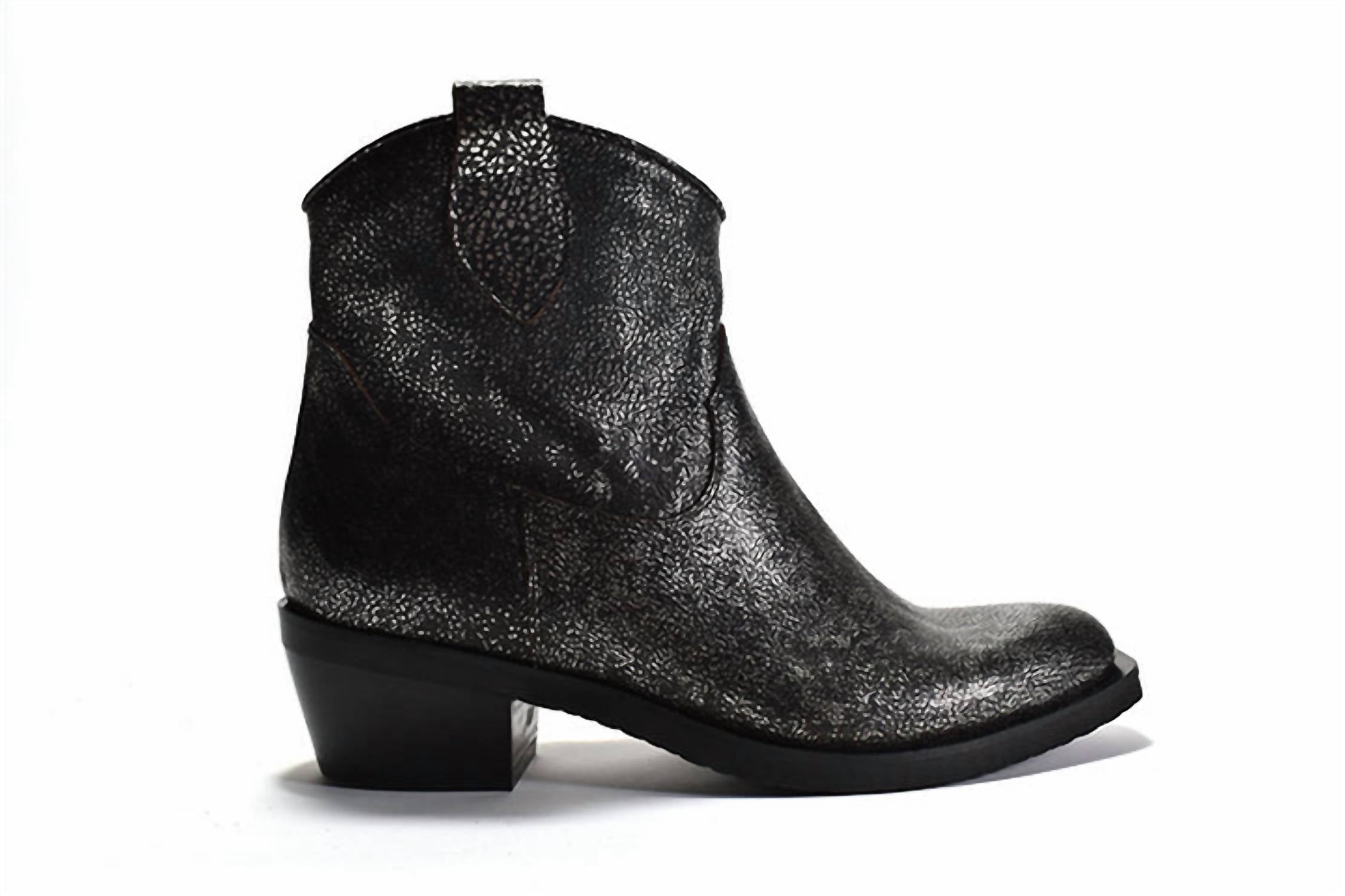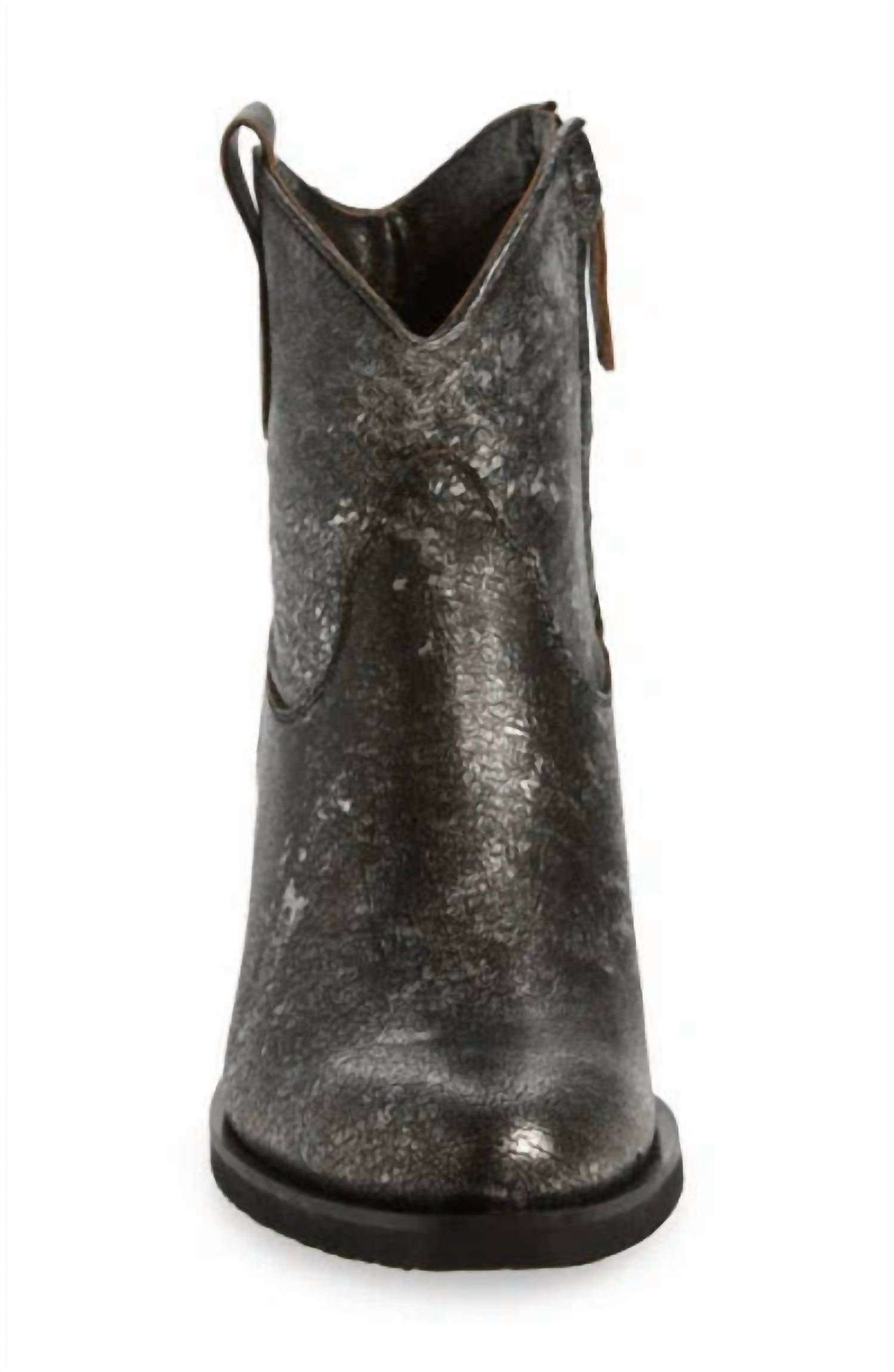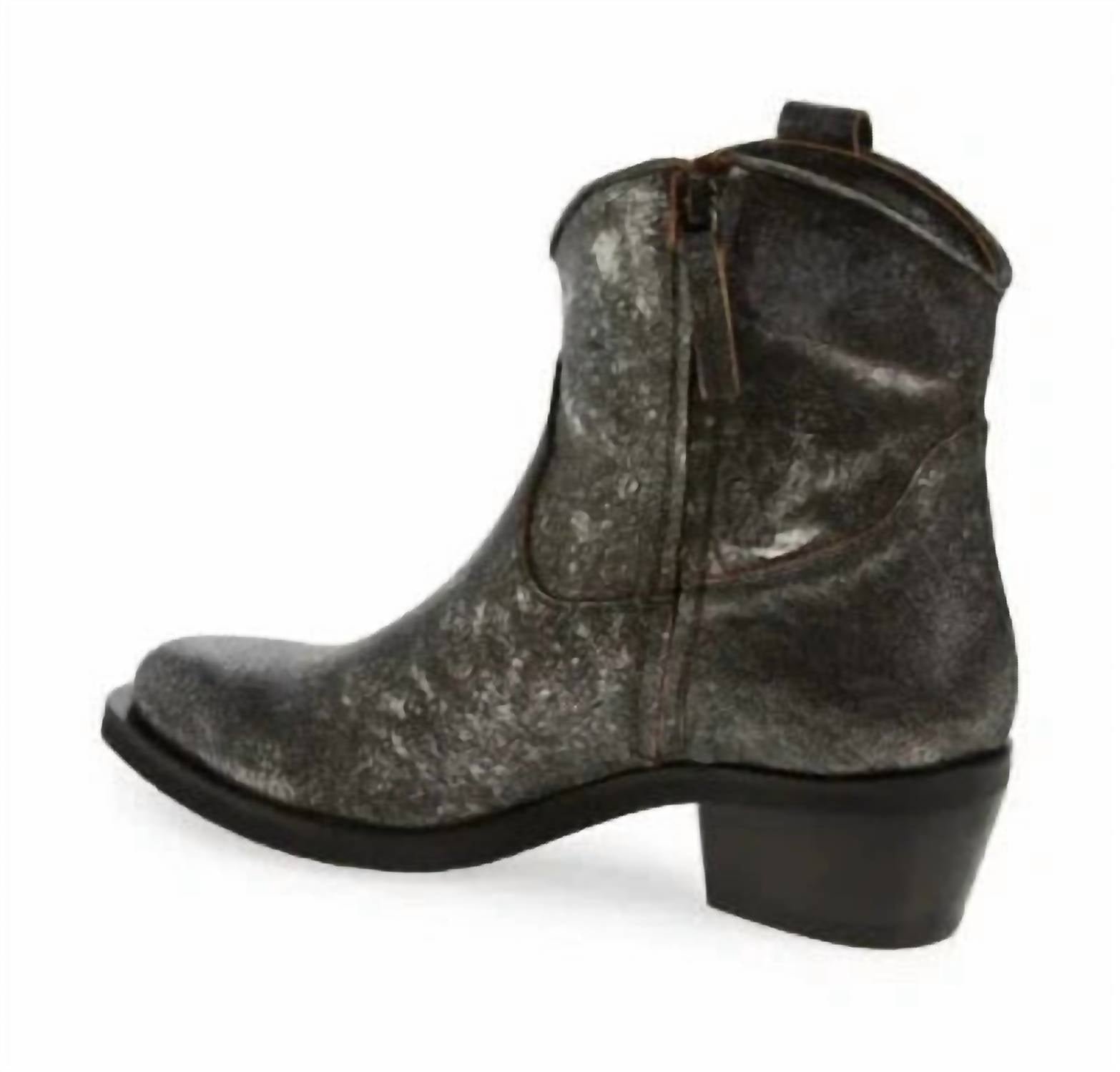 Say hello to the perfect, most versatile boot. The ankle height makes this style easily transition from day to night. Wear them with your favorite skinny jeans and tee for a more laid back look, or pair them with your favorite mini dress and jacket for a night out on the town. Step out in style with the Provo Boots by CORDANI, featuring a distressed embroidered toe and an almond shape for a touch of Western flair. Designed in a striking pewter crackle finish, these boots boast a 2-inch block heel that offers both height and comfort. Made in Italy, they include an inside zipper and leather lining, complemented by a durable rubber outsole for reliable traction. Perfect for any occasion, they combine quality craftsmanship with contemporary design.