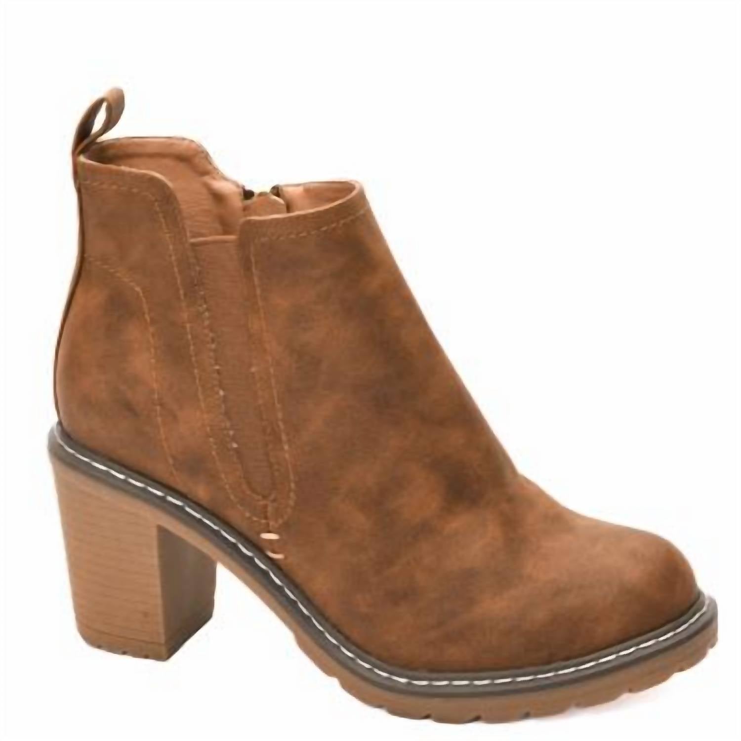 Introducing the Women's Bite Me Boot by Corkys Footwear, a chic addition to any wardrobe in a rich Cognac hue. These leather ankle boots feature a practical side elastic and a convenient side zipper for ease of movement. Designed with a 2-inch block heel and a round toe shape, they're perfect for both style and comfort. The slip-resistant soles ensure stable footing wherever you go.