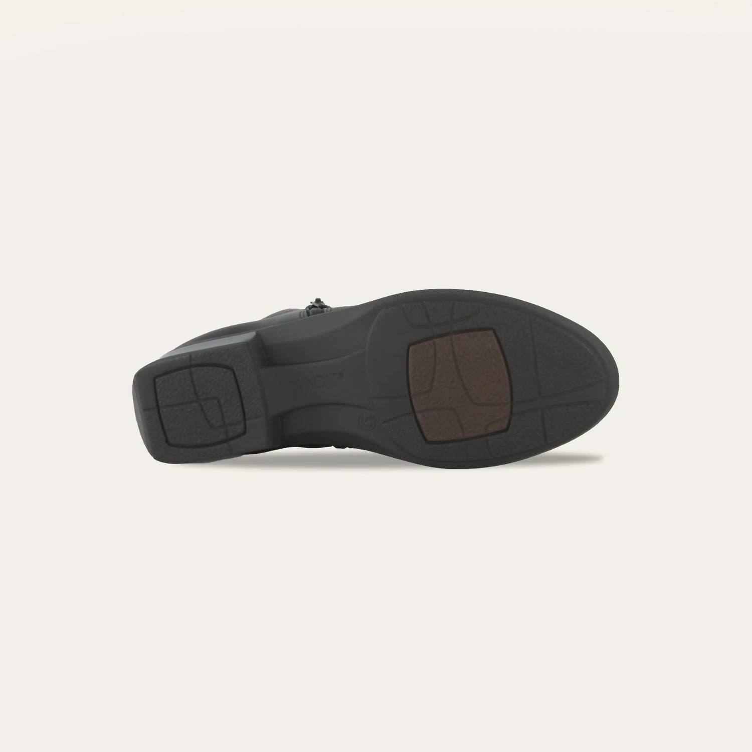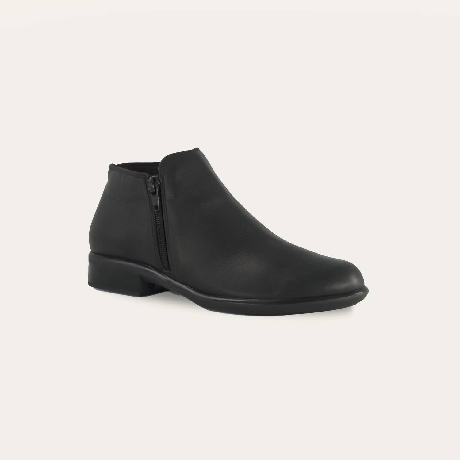 Introducing the Naot Women's Helm Water Resistant Leather Boot, a chic and functional option for every dinner party this fall. Made from black leather, these ankle boots feature a convenient double zipper closure, medium shoe width, and a comfortable round toe design. The boots' padded heel cup and instep, alongside a removable cork and latex footbed, ensure exceptional comfort and adaptability. With a minimalist flat heel and lightweight sole reinforced by a metal shank, you're guaranteed both durability and slip resistance. Perfect for the modern woman seeking style and ease.