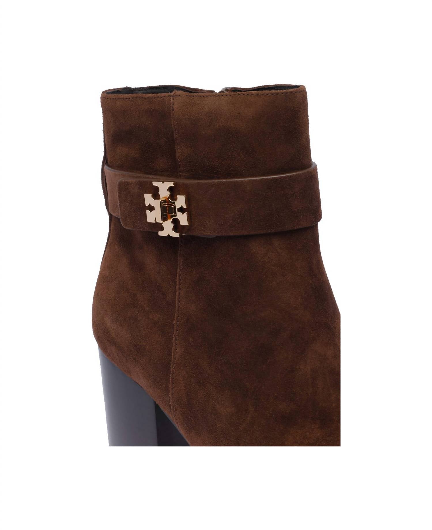 Say hello to the perfect, most versatile boot. The ankle height makes this style easily transition from day to night. Wear them with your favorite skinny jeans and tee for a more laid back look, or pair them with your favorite mini dress and jacket for a night out on the town. These Tory Burch brown T Lock pump booties feature a sophisticated round toe design with a luxurious suede upper and a stylish lateral golden logo accent. They are equipped with a convenient lateral zip closure for easy wear. Crafted from 100% calf leather with a leather sole, these imported shoes are available in a rich brown color. The heel measures approximately 8.5 cm, and the model number is 156277200, ensuring a sleek and elegant fit.