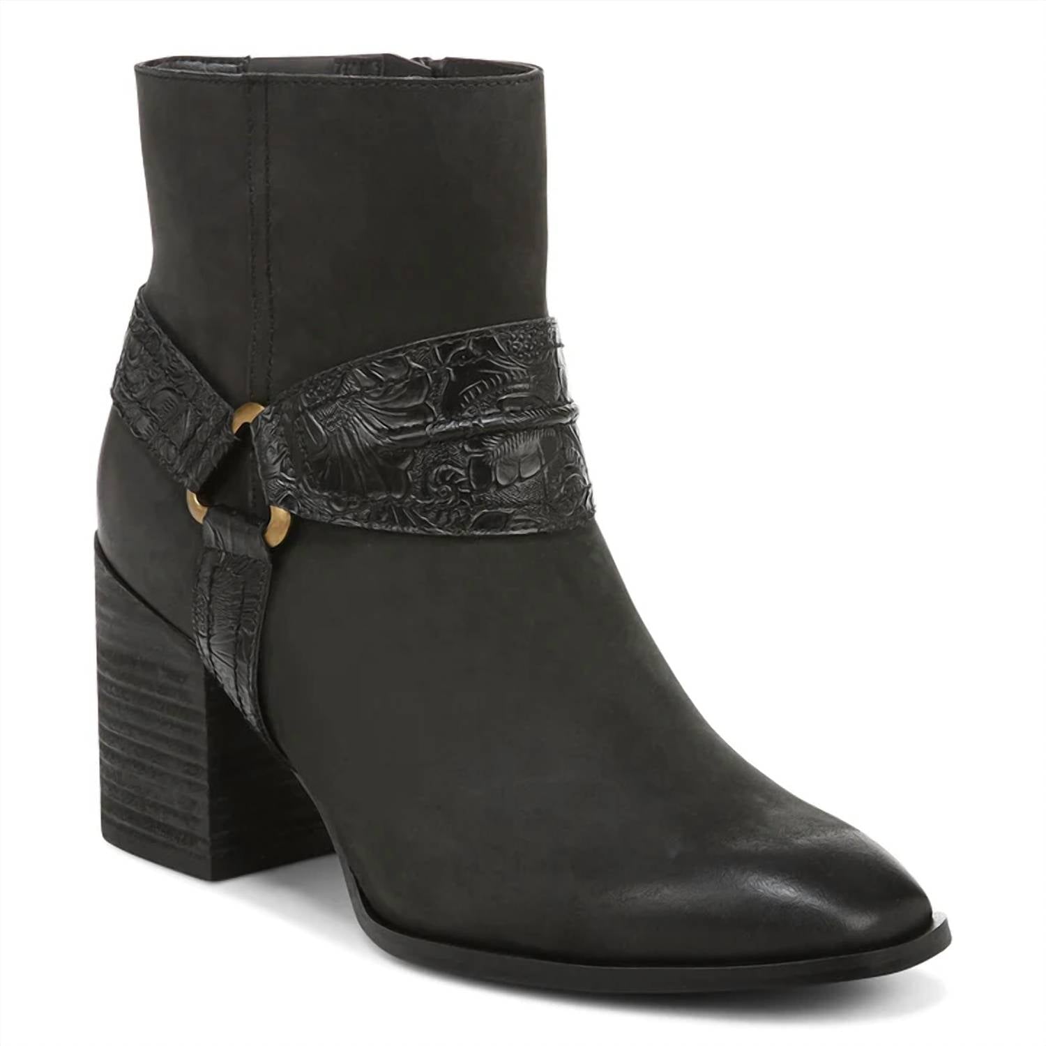 Say hello to the perfect, most versatile boot. The ankle height makes this style easily transition from day to night. Wear them with your favorite skinny jeans and tee for a more laid back look, or pair them with your favorite mini dress and jacket for a night out on the town. Western flair meets modern functionality. Crafted from water repellent leather in classic black, these boots feature elegant tooled-leather detailing and a comfortable block heel measuring 3.25 inches. The removable fabric-covered EVA footbed and durable rubber outsole ensure both comfort and stability, making these above-ankle boots a versatile choice for any occasion. Perfect for the fashion-forward woman who demands both style and practicality.
