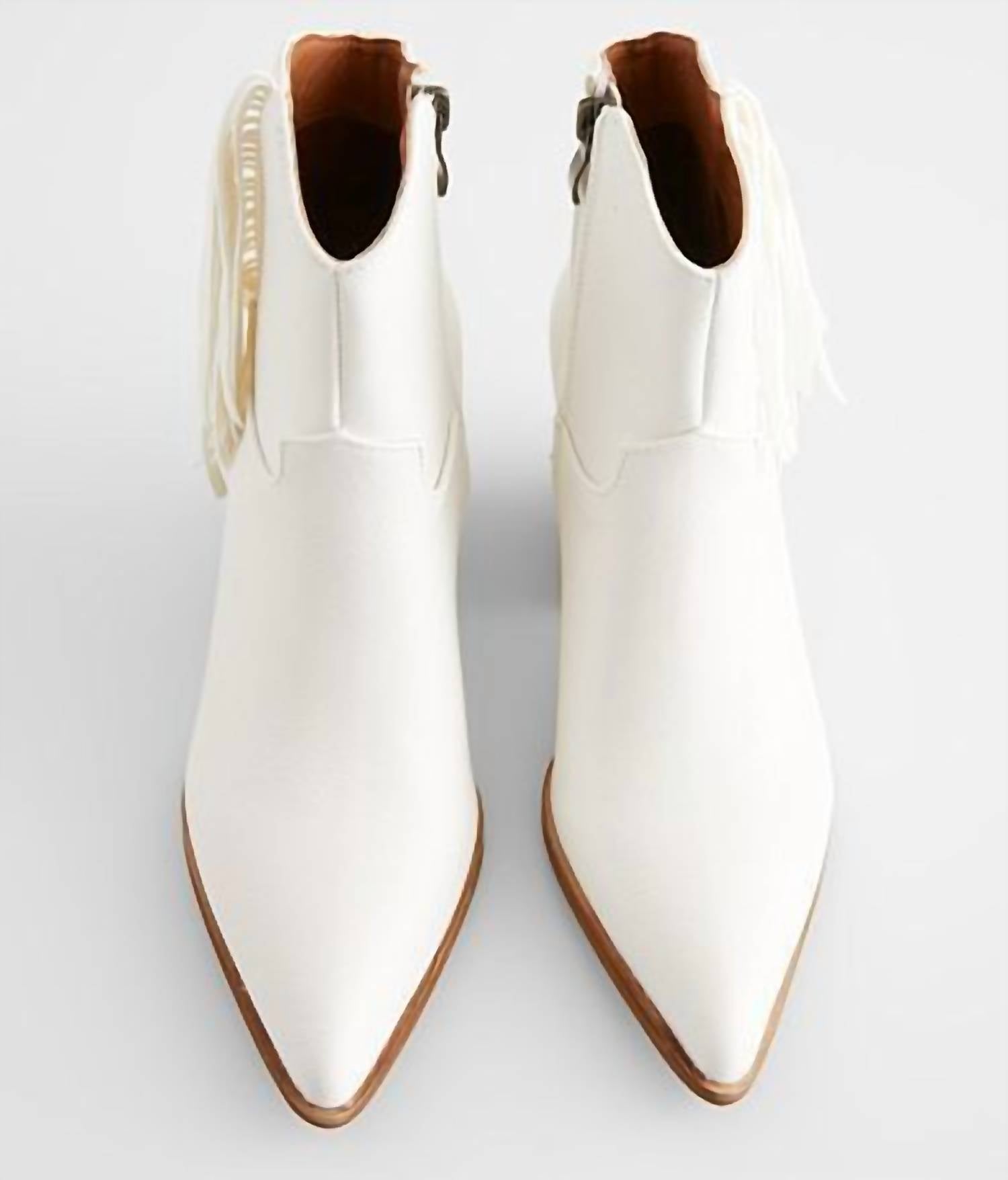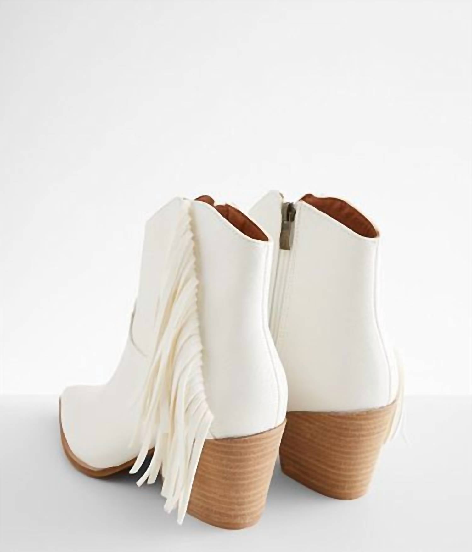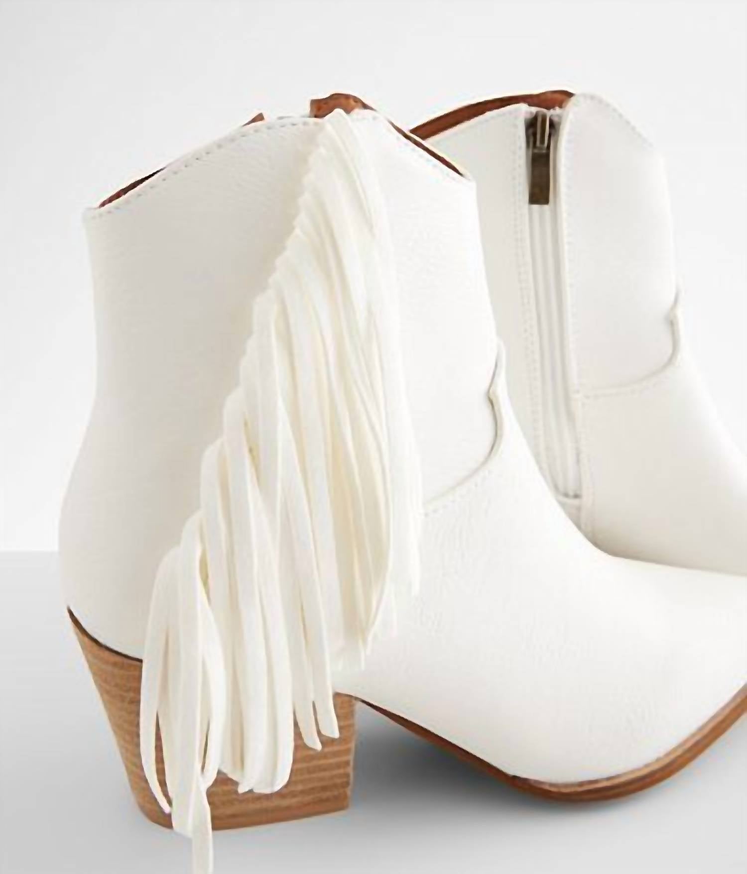 Say hello to the perfect, most versatile boot. The ankle height makes this style easily transition from day to night. Wear them with your favorite skinny jeans and tee for a more laid back look, or pair them with your favorite mini dress and jacket for a night out on the town. Step into retro-inspired style with the Bonnie Boots by Beast Fashion, featuring a playful white fringe and tassel design that channels the spirit of the '60s. Crafted from faux leather, these booties boast a chic pointed toe and stable block heel with a heel height of 3 inches, complemented by a shaft height of 9.5 inches. Perfect for a range of occasions, these boots exude a throwback charm while providing modern comfort. Available in sizes 5.5 to 10, they are a statement addition to any wardrobe.