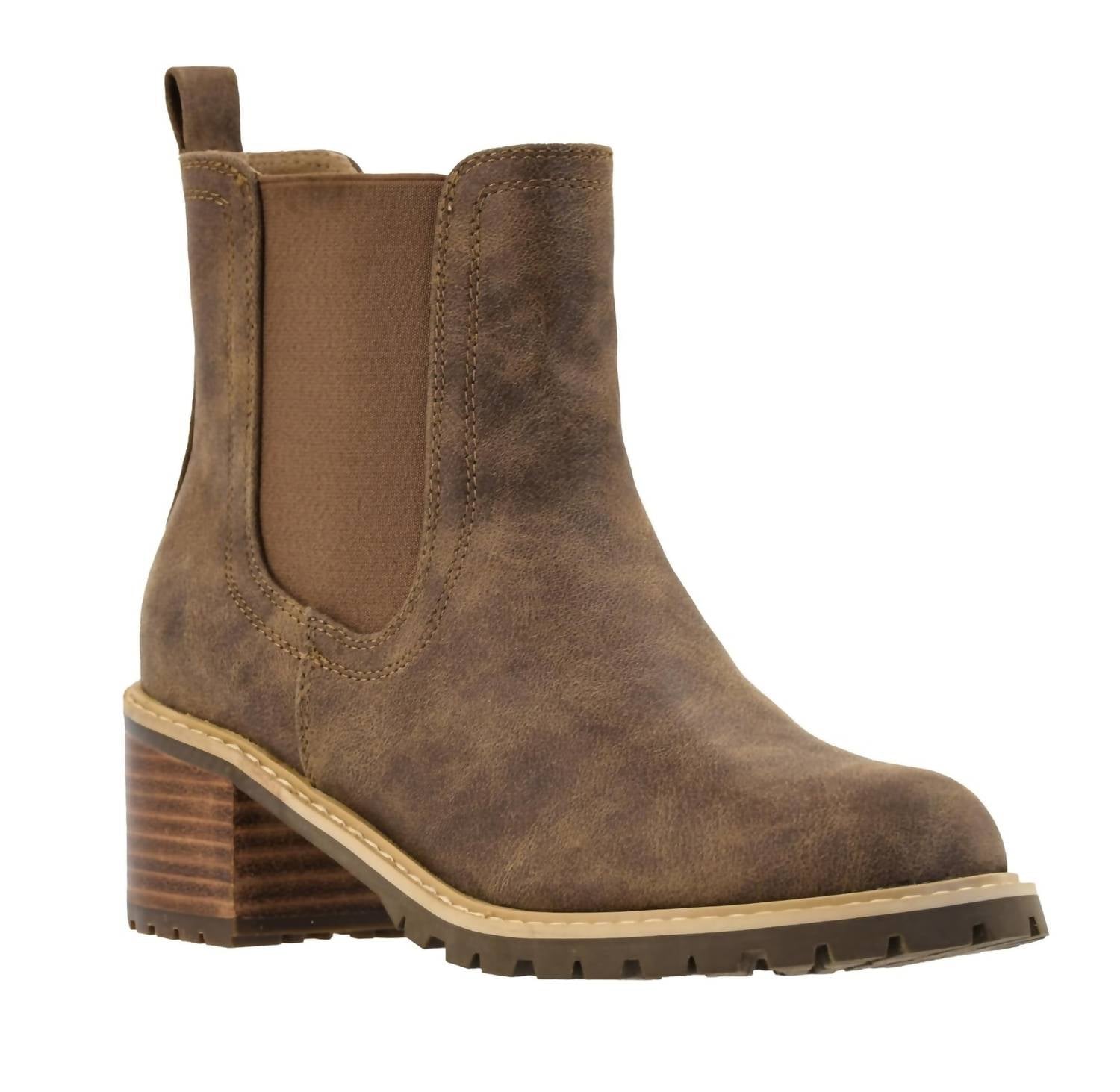 Upgrade your shoe game with these classic heeled boots, designed to merge sophistication and style. Comfortable enough for long days or a night out on the town. Elevate your fall wardrobe with the Women's Doohickey Boots by Corkys Footwear, crafted in a chic taupe shade perfect for any outfit. Designed with a mid-height 2.25-inch block heel, these boots provide just the right amount of lift without compromising on comfort. The round toe shape and stretchy panels offer easy on-and-off wear, while Corkys Soft memory foam insoles ensure all-day comfort. Proudly step into autumn with these stylish heeled boots.