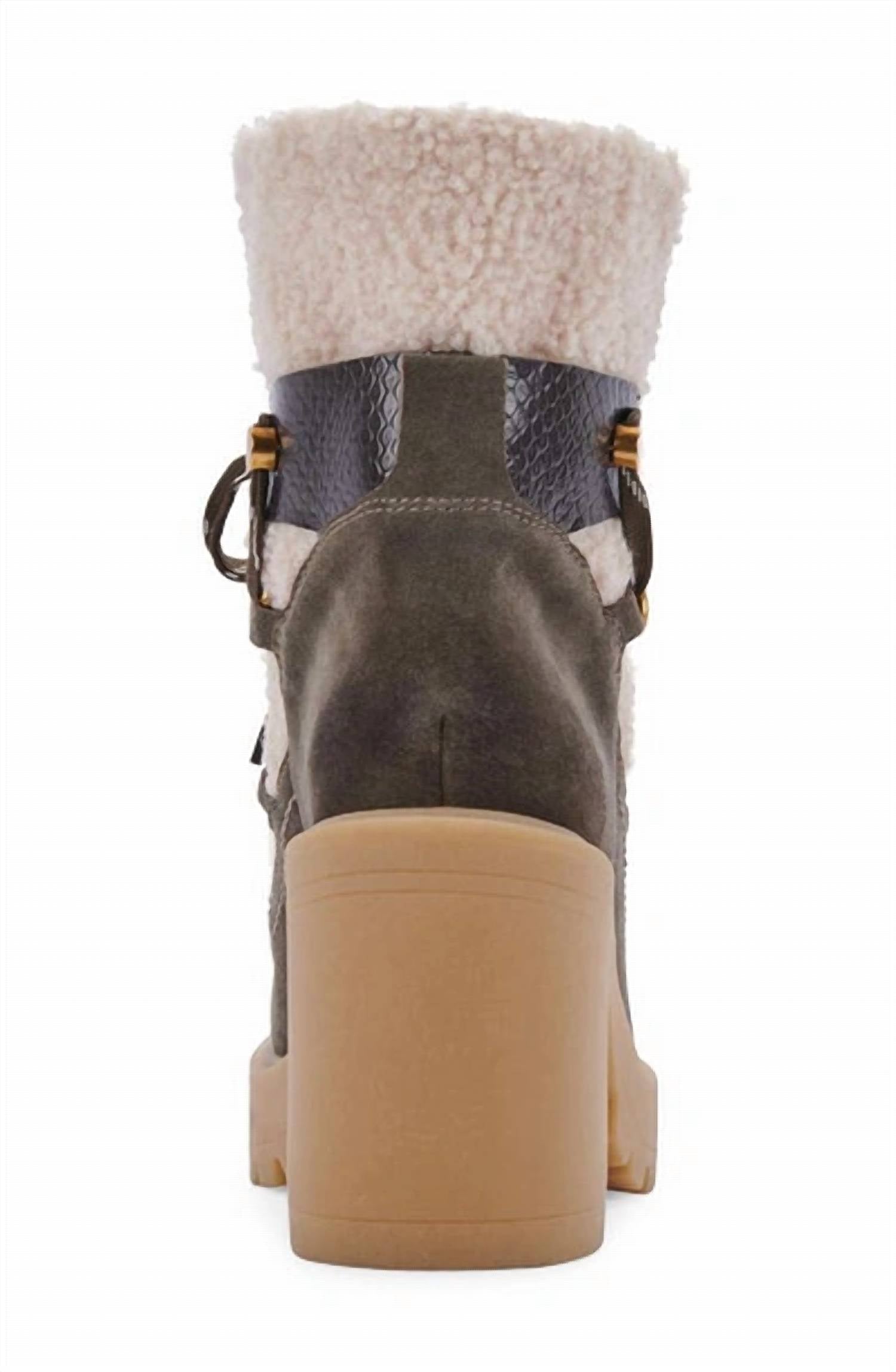 Step out in style in olive heeled boots. feature a round toe, faux-shearling details, and practical back pull tab, with a lace-up design for a snug fit. luxe leather upper is complemented by a comfortable recycled microsuede fabric lining. All set on a lugged sole with a 3.62" rubber block heel. Shaft measures 6.69" with an 11.41" circumference for a sleek silhouette.