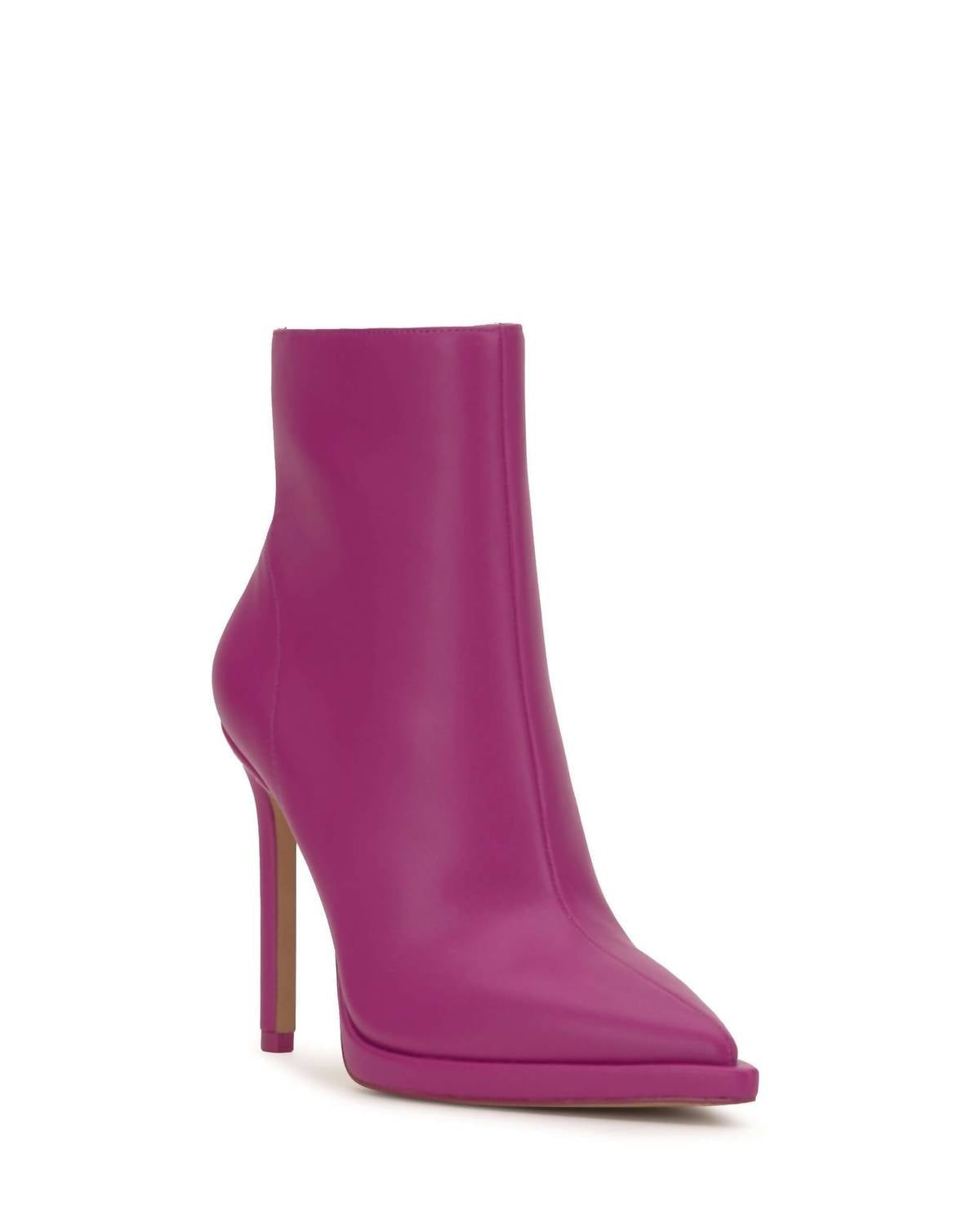 Step up your style game with the Women's High Heel Leather Bootie from Jessica Simpson, crafted in chic pink faux leather. With a sultry pointed toe and a platform heel, these booties feature an impressive 4.3" heel height, complementing the 5" shaft height and 10.6" shaft circumference for an eye-catching silhouette.