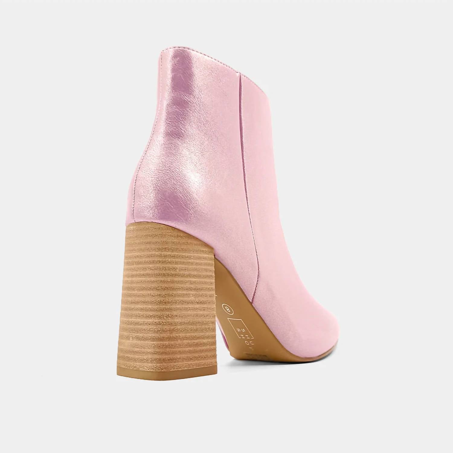Step out in confidence and showcase your impeccable taste with these fashionable and versatile boots. Their classic style will have you reaching for these boots season after season. The Women's Veronica Bootie by SHU SHOP is a masterclass in versatility, showcasing a sleek and understated silhouette that pairs effortlessly with anything from cropped jeans to midi skirts. Crafted with sharp materials, this pink ankle bootie features a comfortable platform heel and a chic pointed toe. Perfect for any occasion, the Veronica Bootie combines style with comfort for the modern woman.