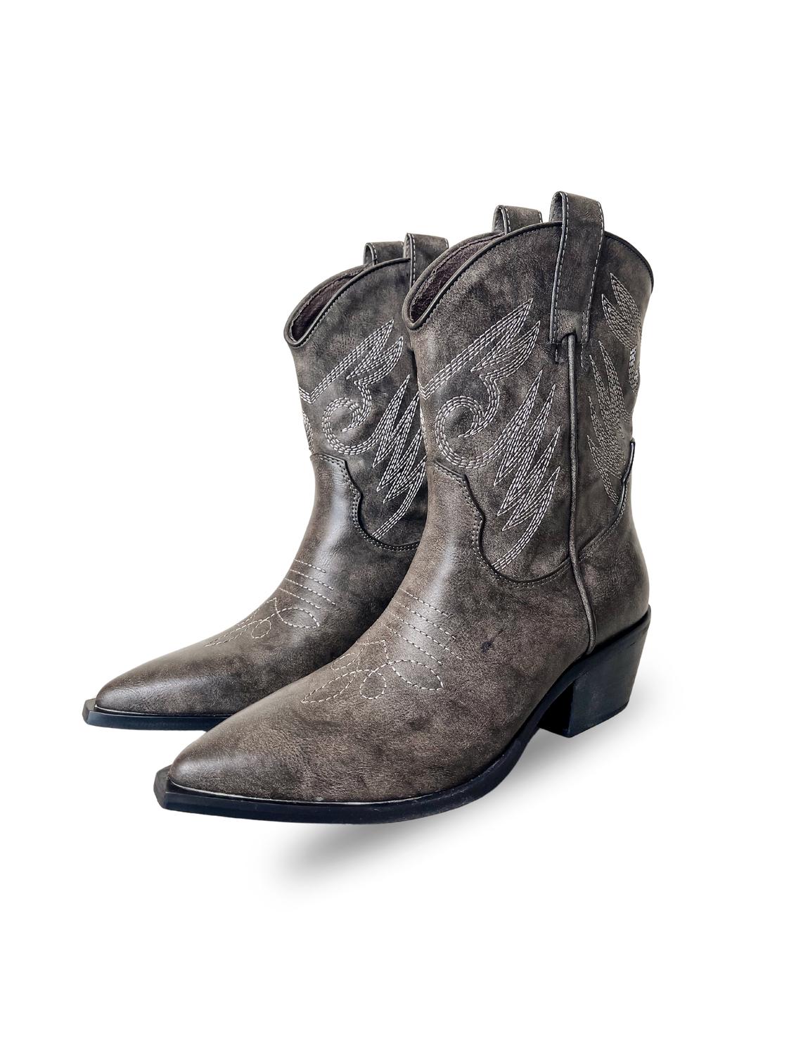 A stylish boot with a comfortable fit and the perfect amount of height. These classic boots are the perfect addition to any outfit and can be worn season after season. Introducing the Women's Zahara Western Boots by SHU SHOP, a perfect blend of style and comfort in a chic grey hue. These boots feature a pointed toe design and a 2-inch stacked heel, adding a sleek touch to any outfit. With a padded insole, they're designed for all-day wear, whether at the ranch or out on the town. The Zahara boots promise a western flair that ensures you look effortlessly cool.