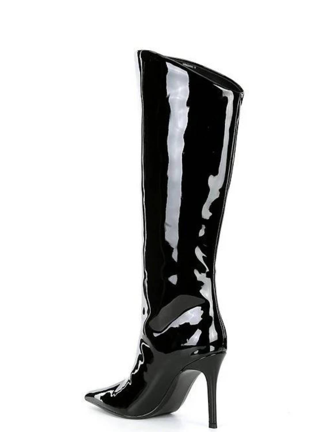 Upgrade your shoe game with these classic heeled boots, designed to merge sophistication and style. Comfortable enough for long days or a night out on the town. Patent synthetic upper. Pull-on design. Synthetic lining. Synthetic outsole. Approx. 12.5" shaft height. Approx. 15" shaft circumference. Approx. 4" heel height. Imported.
