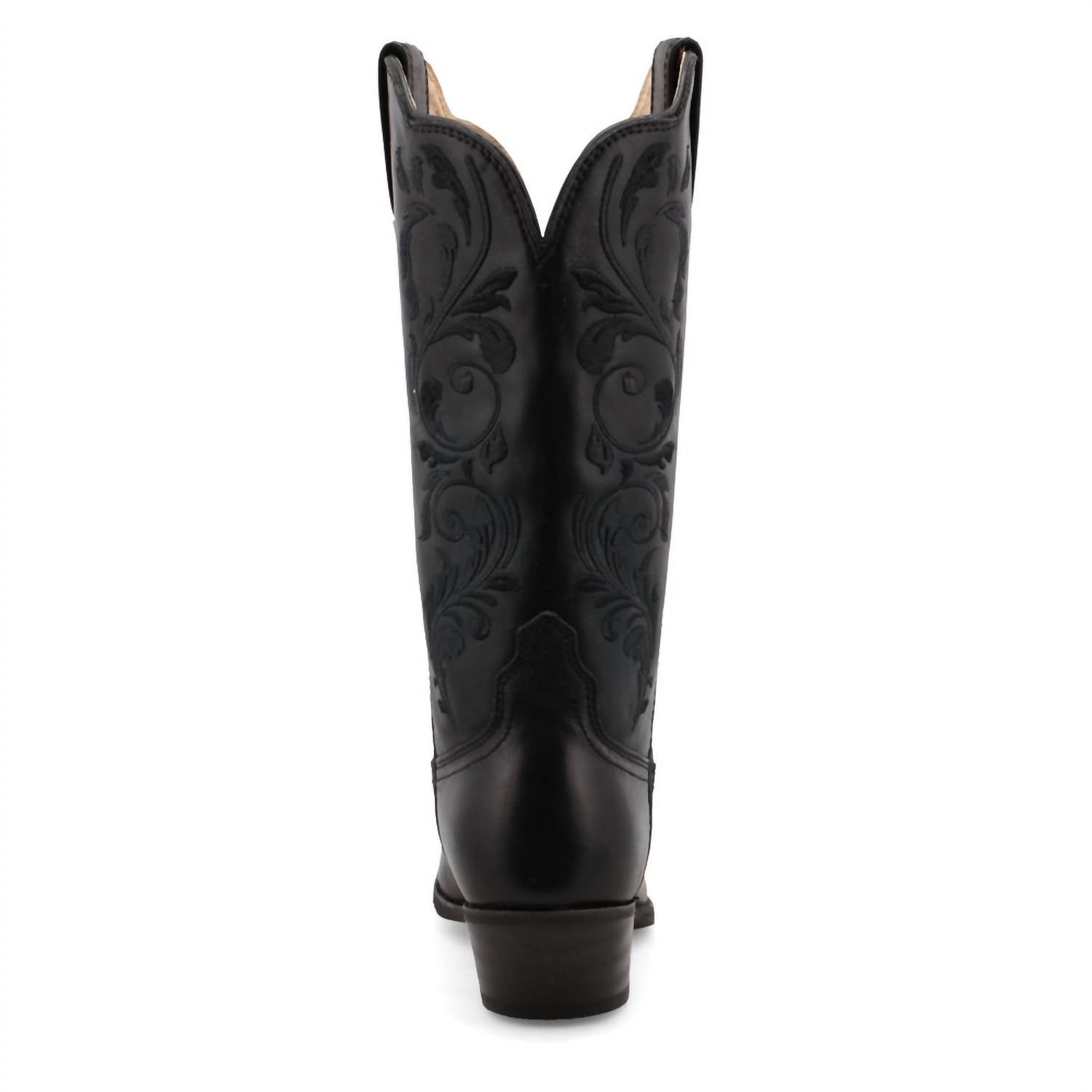 A stylish boot with a comfortable fit and the perfect amount of height. These classic boots are the perfect addition to any outfit and can be worn season after season. Step out in style with the Western Leather R-Toe Boot by Twisted X, an ideal choice for blending classic western aesthetics with modern comfort. Expertly crafted in black full-grain leather, these boots feature a molded rubber outsole for superior flexibility right from the start. The block heel stands at a comfortable 1.75 inches, making them perfect for a night out or everyday wear. Designed with a sophisticated almond toe shape, these boots are a blend of tradition and innovation for the modern woman.