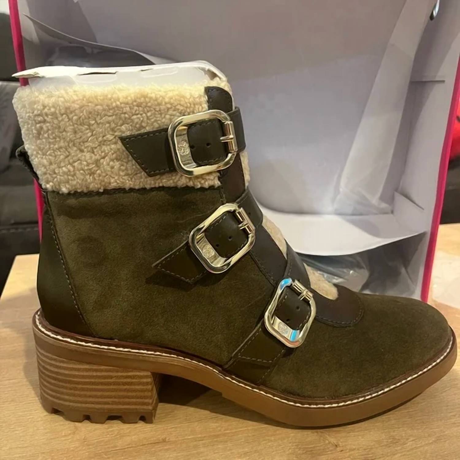 A stylish boot with a comfortable fit and the perfect amount of height. These classic boots are the perfect addition to any outfit and can be worn season after season. Elevate your winter wardrobe with the Women's Klerica Leather Boots from Vince Camuto, expertly crafted from olive faux leather for a chic, textured finish. Designed with a faux fur lining, almond toe, and flat heel, these mid-height heeled boots are perfect for staying warm and stylish during all your adventures. The lug bottom and buckle accents add a rugged flair, making them an essential part of your cold-weather attire. These boots arrive wrapped for your convenience, ensuring you step out in style every time.