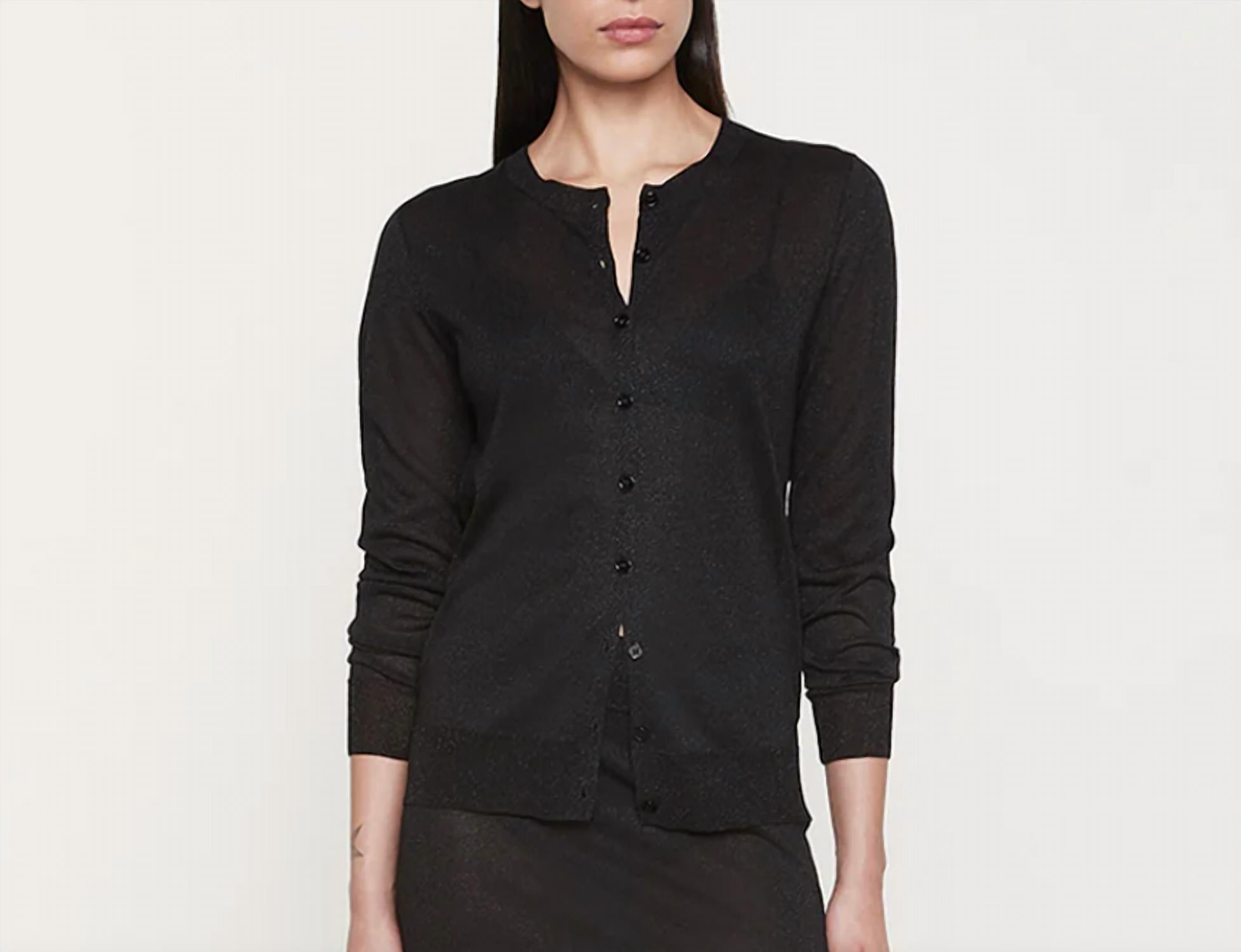 This cardigan will be a sweater-rotation favorite. Introducing the Lamé Cardigan by Enza Costa, an elegant black piece perfect for holiday layering. This cardigan showcases long sleeves, crafted from a lightweight blend of 73% viscose, 16% nylon, and 12% metallic yarn for a touch of shimmer. Closure: Delicate button closure down the front. Made in China.