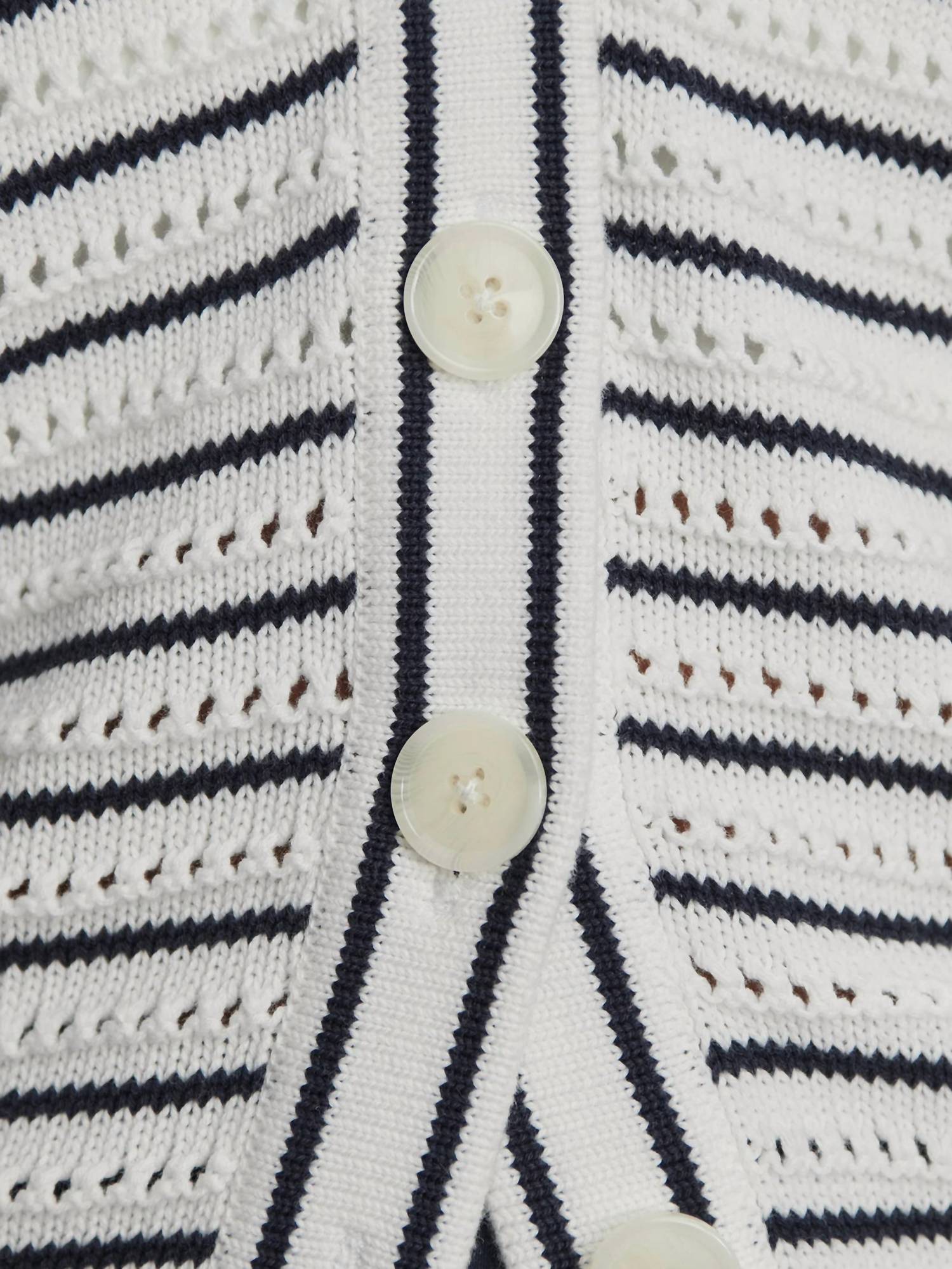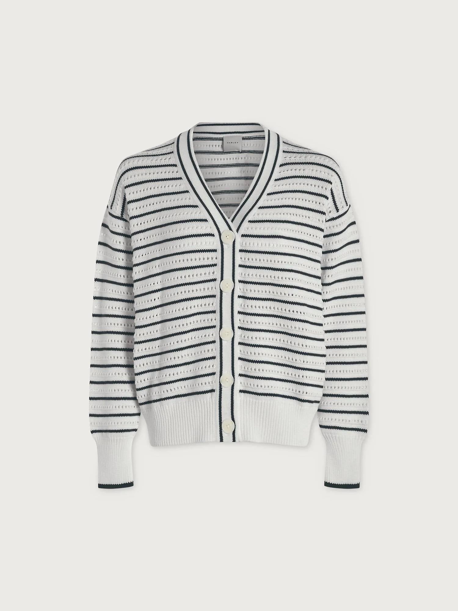 Throw this adorable cardigan over any cami or tank top. Discover the Antonia Relaxed Cardigan by Varley, an elegant addition to your fall wardrobe. This black and white knit cardigan features long sleeves and a chic V-neckline, accentuated by an all-over contrasting stripe. It boasts a relaxed fit with dropped shoulders and is completed with a button closure and ribbed hemline and cuffs. The perfect choice for a holiday party, this piece offers both style and comfort.