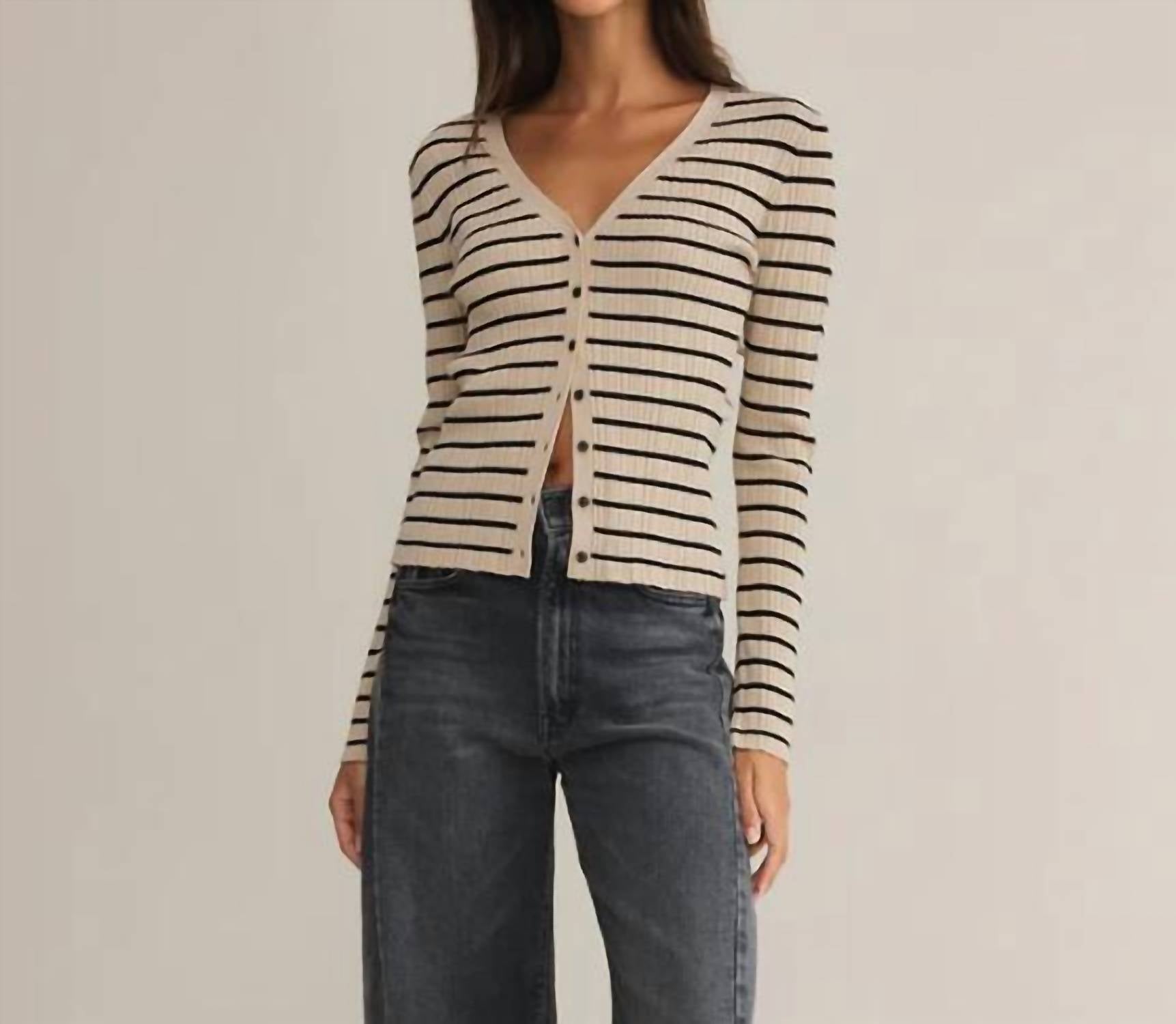 Throw this adorable cardigan over any cami or tank top. Meet the Jordana Stripe Sweater by Z Supply, a chic and fitted cardigan designed for stylish versatility. This long sleeve piece features tan and black stripes in a soft ribbed fabric that’s 70% Rayon and 30% Polyester, ideal for both layering and standalone wear. With a flattering V-neck and button closure, this midweight sweater offers a touch of elegance to everyday outfits. Care instructions recommend hand washing separately and reshaping to lay flat to dry or opt for dry cleaning. Brooke, 5’0”, is wearing a size small and usually fits in a small/medium top.