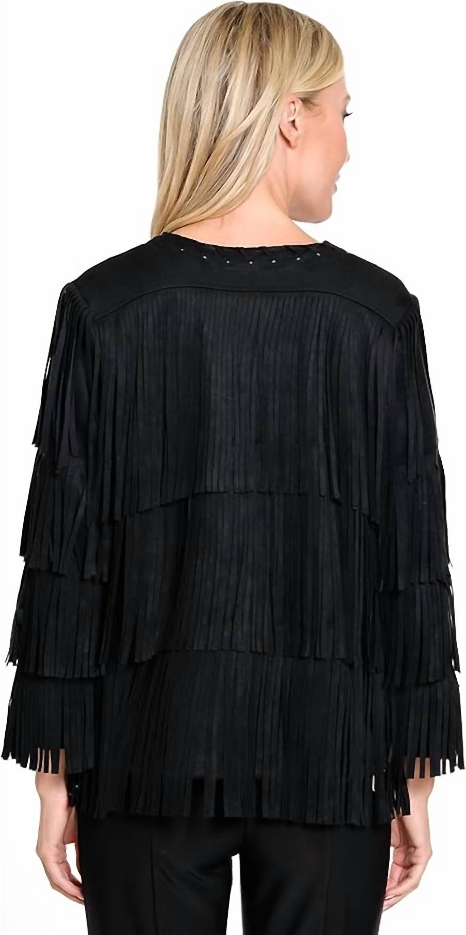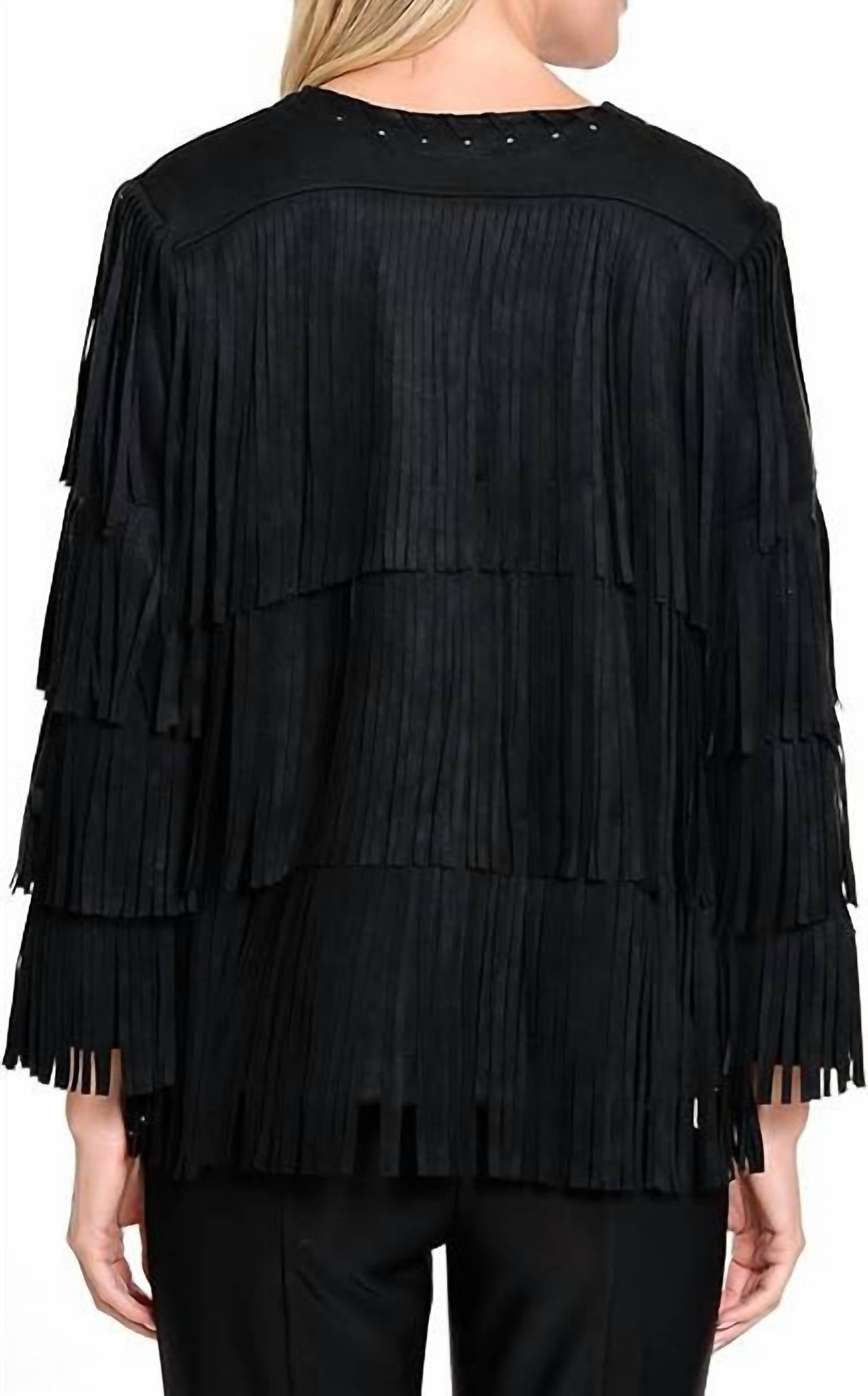 The coolest cape you ever did see. Elevate your evening ensemble with the Ali Miles Faux Suede Fringe Jacket, designed for stylish women who appreciate boho chic flair. Featuring long sleeves, this black jacket is crafted from solid faux knit suede with fashionable fringe detailing. Closure: Pull on, with a V-neckline perfect for spring events. Care: Dry clean only.