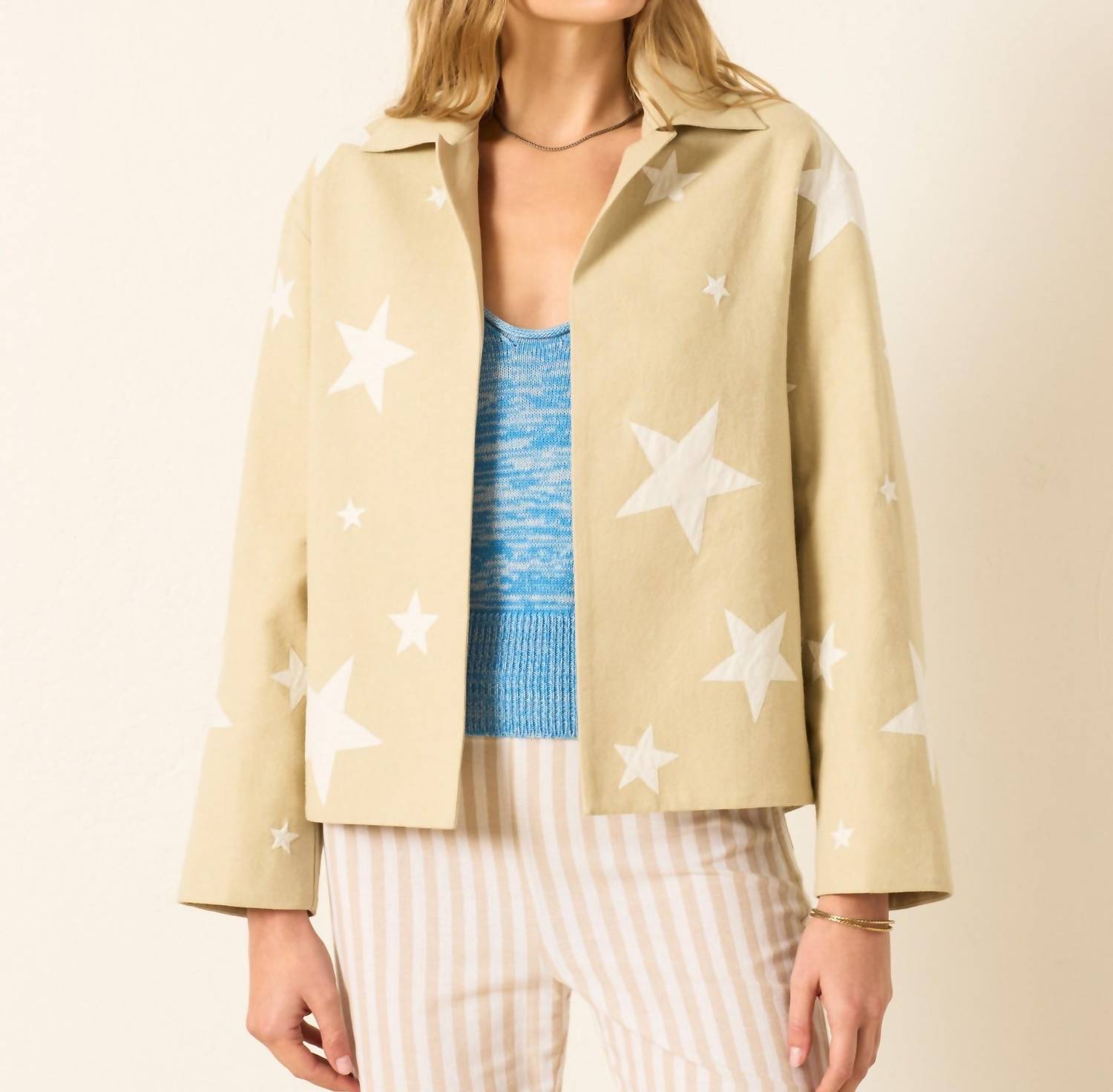 Introducing the Western Star Jacket by ALIX OF BOHEMIA, a distinctive piece in Grey Birchwood with a minimalist Western flair. This utility jacket is crafted from 100% cotton, featuring long sleeves with dropped shoulders for an easy fit, adorned with a hand-embroidered star motif for a graphic punch. The thoughtful design offers an opportunity to showcase its unique contrasting lining by wearing it with the sleeves cuffed. Embrace the artisanal charm inherent in every jacket, making it a standout choice for the spring season.