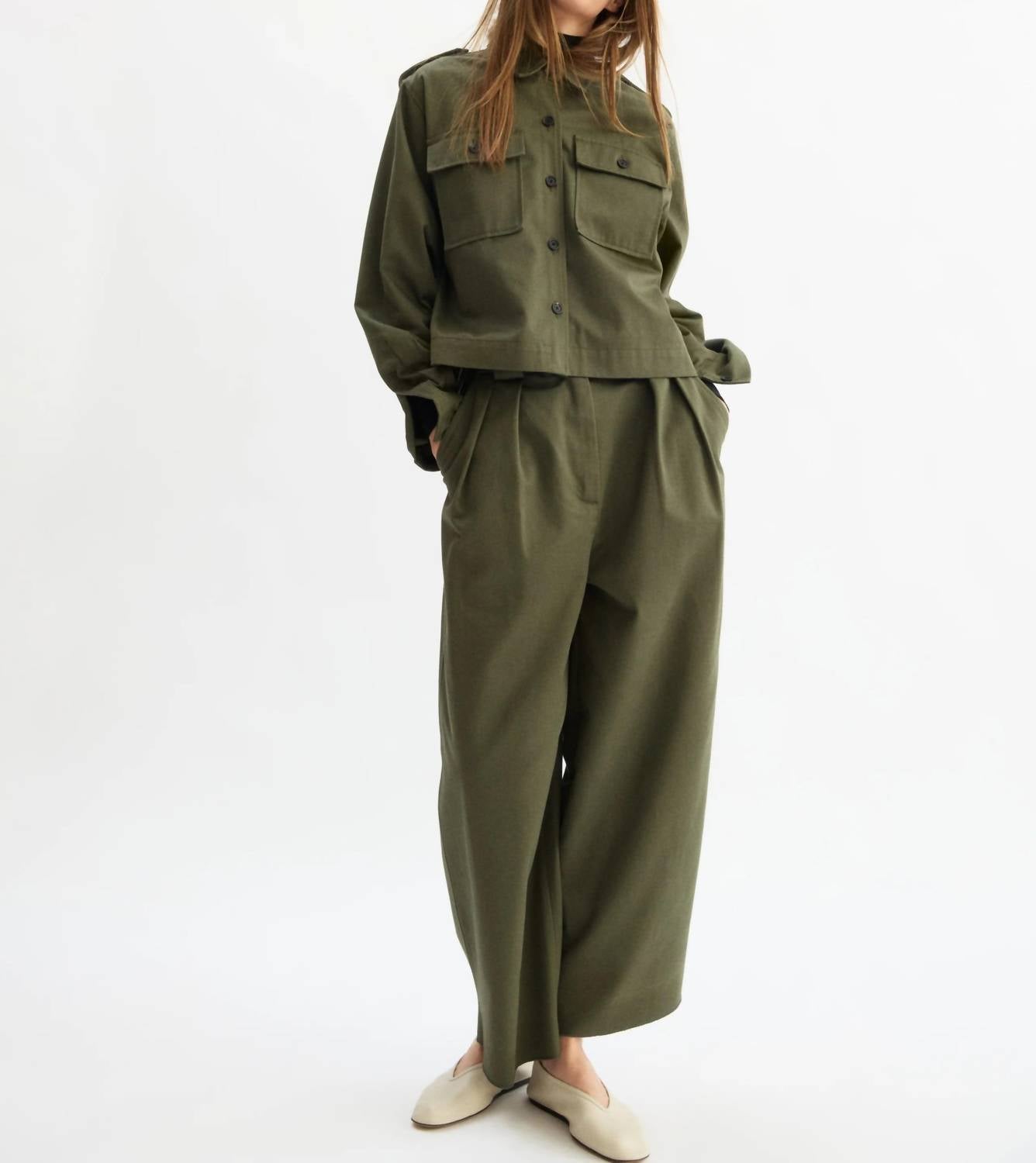 Cute, casual, and comfortable. This jacket is a must have. Introducing the Henry Short Shirt Jacket by Arlo Mott, a stylish olive piece perfect for springtime and holiday parties. This women's casual jacket features full-length sleeves, a collar neckline, and utility-inspired details like epaulets at the shoulders and real horn buttons, with functional pockets adding practicality. Crafted from 100% Japanese Twill and made in New York, it offers a swingy shape that fits true to size. Closure: Button closure. Care: N/A. Model is 5'9" and wears a size small.