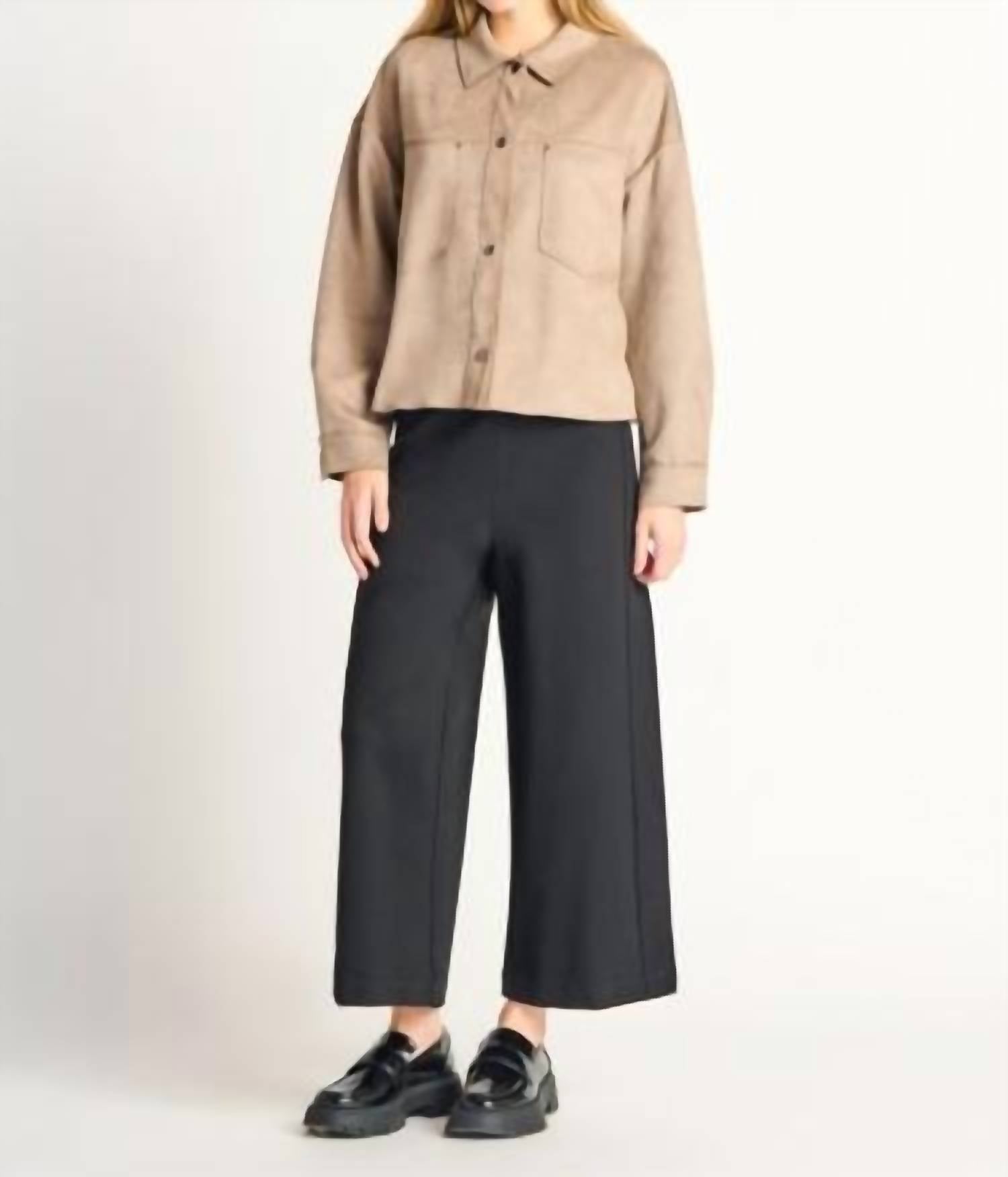 The coolest, most versatile utility jacket. Match it with your favorite pair of denim or throw it over any day dress. Meet the Vegan Suede Jacket by BLACK TAPE, an ultimate cool-girl utility piece perfect for your minimalist wardrobe. Made from 94% polyester and 6% spandex, this long-sleeve jacket offers a soft faux suede feel and a boxy fit ideal for travel or Thanksgiving gatherings. It features a convenient button closure along with two front pockets for added utility. Available in a solid taupe color, this jacket is a chic addition to any spring ensemble.