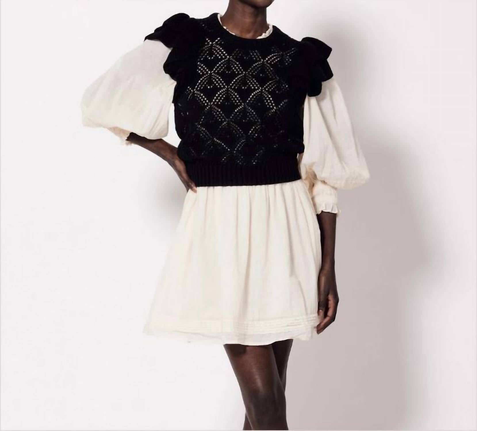 Introducing the Colleen Sweater Vest by Cleobella, a chic black vest featuring playful ruffle cap sleeves for a feminine touch. Crafted from high-quality cotton, this textured vest offers versatile styling options—wear it alone or layer over your favorite dress for added flair. Care instructions include hand washing and drying flat to maintain its elegant structure. Please note, the dress under the vest is not included with purchase.