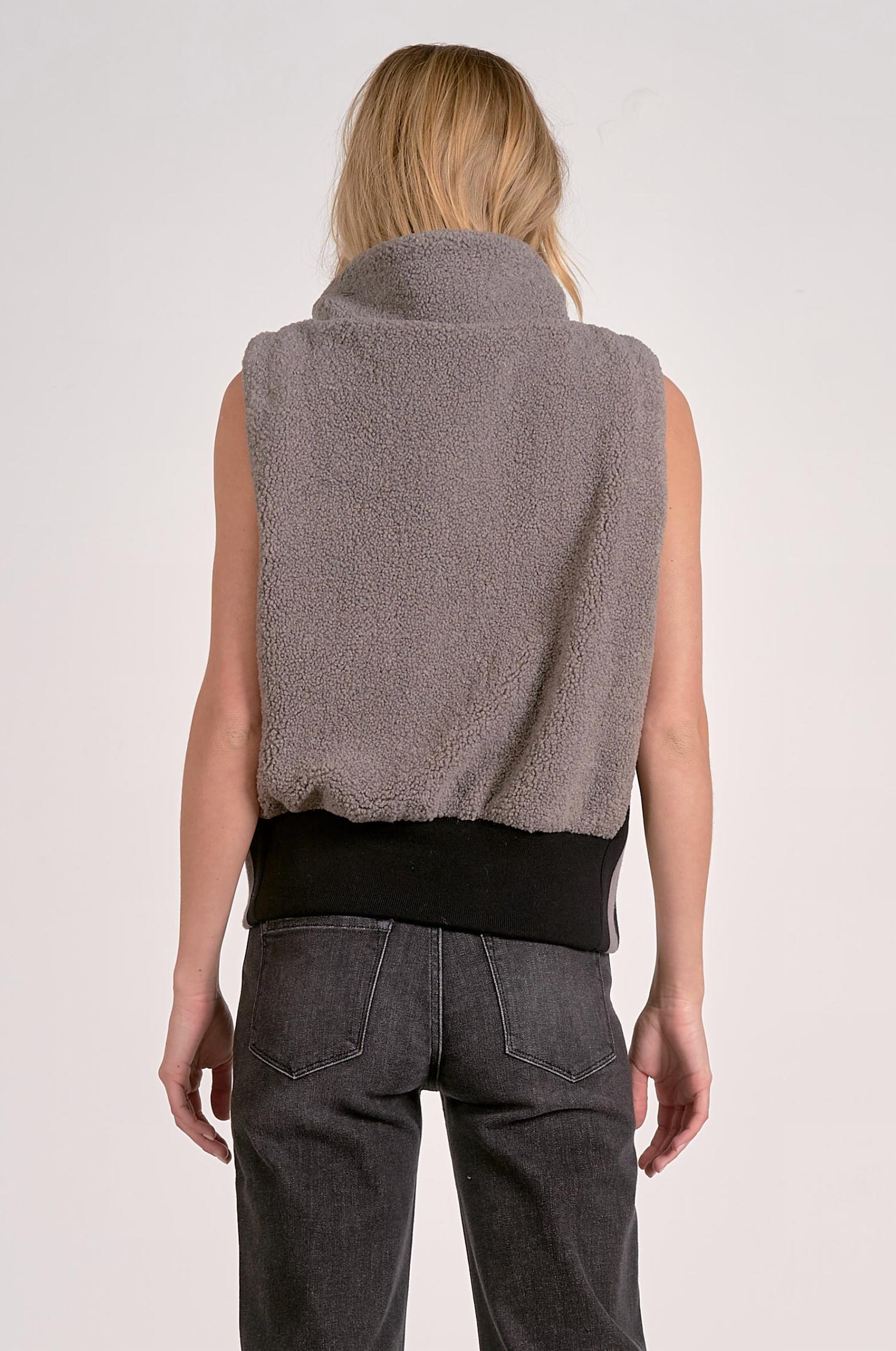 Introducing the Aspen Sherpa Vest by ELAN, a preppy and stylish piece perfect for fall. This sleeveless vest in charcoal features a zip closure and practical pockets, making it both functional and fashionable for holiday parties and cool weather adventures. Crafted from 100% polyester outer with a 50% polyester and 50% viscose lining, it ensures warmth and comfort. Care instructions include hand washing and lining dry. Model is wearing a size small (5'10" height, 32" bust, 24" waist, 34.5" hip).