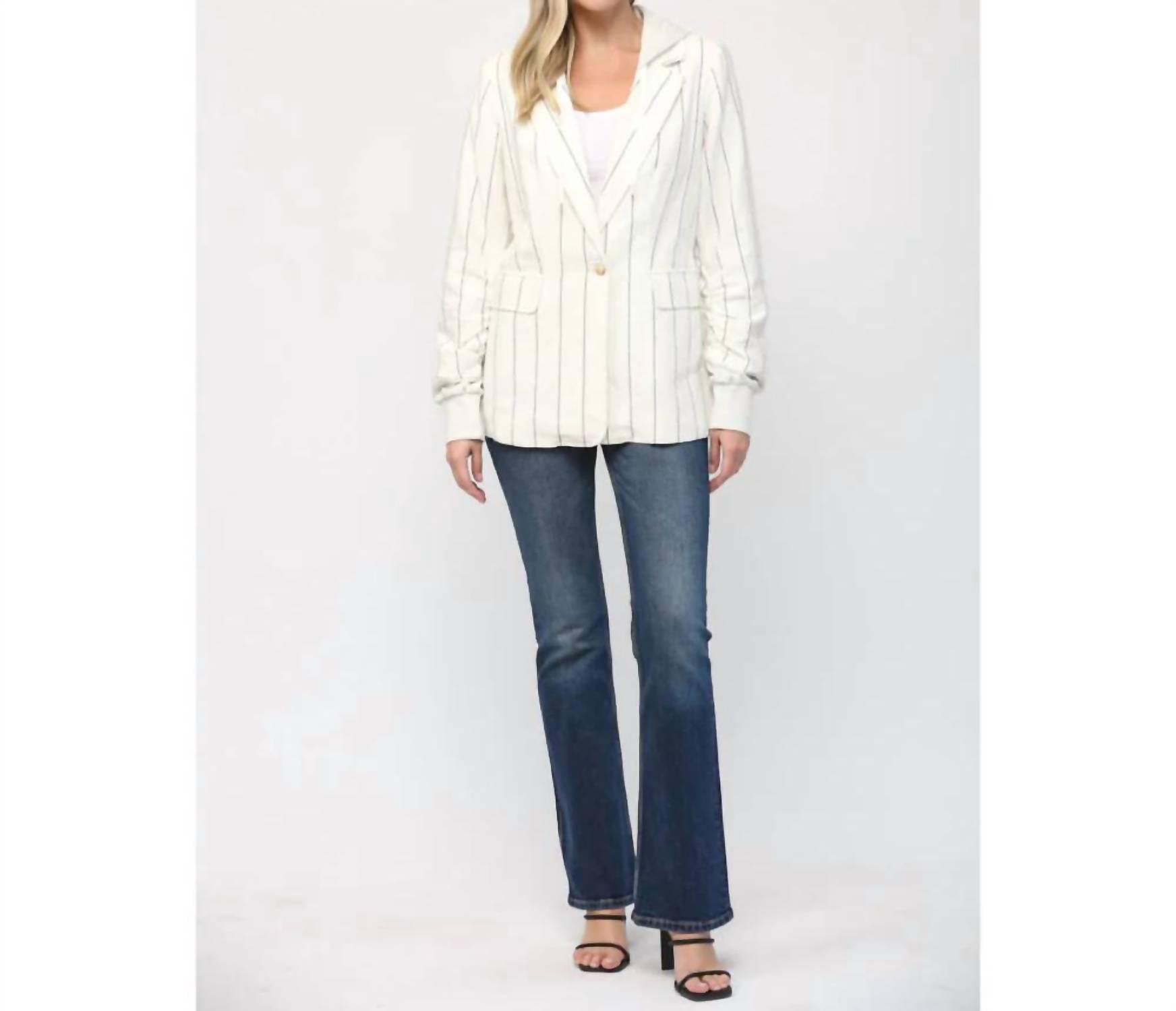 A blazer so versatile you can wear it to the office or pair it with jeans for a more casual look. Step into sophistication with the Blaze-r Of Glory by Fate, an ivory blazer with a chic stripe pattern perfect for workwear and travel occasions. Designed for women, this blazer features long sleeves and a functional button closure, combining elegance with practicality. Crafted from a comfortable linen blend, 95% linen and 45% cotton, it offers both style and warmth ideal for the winter season. Pockets are included for added convenience, although specific care instructions are not provided.
