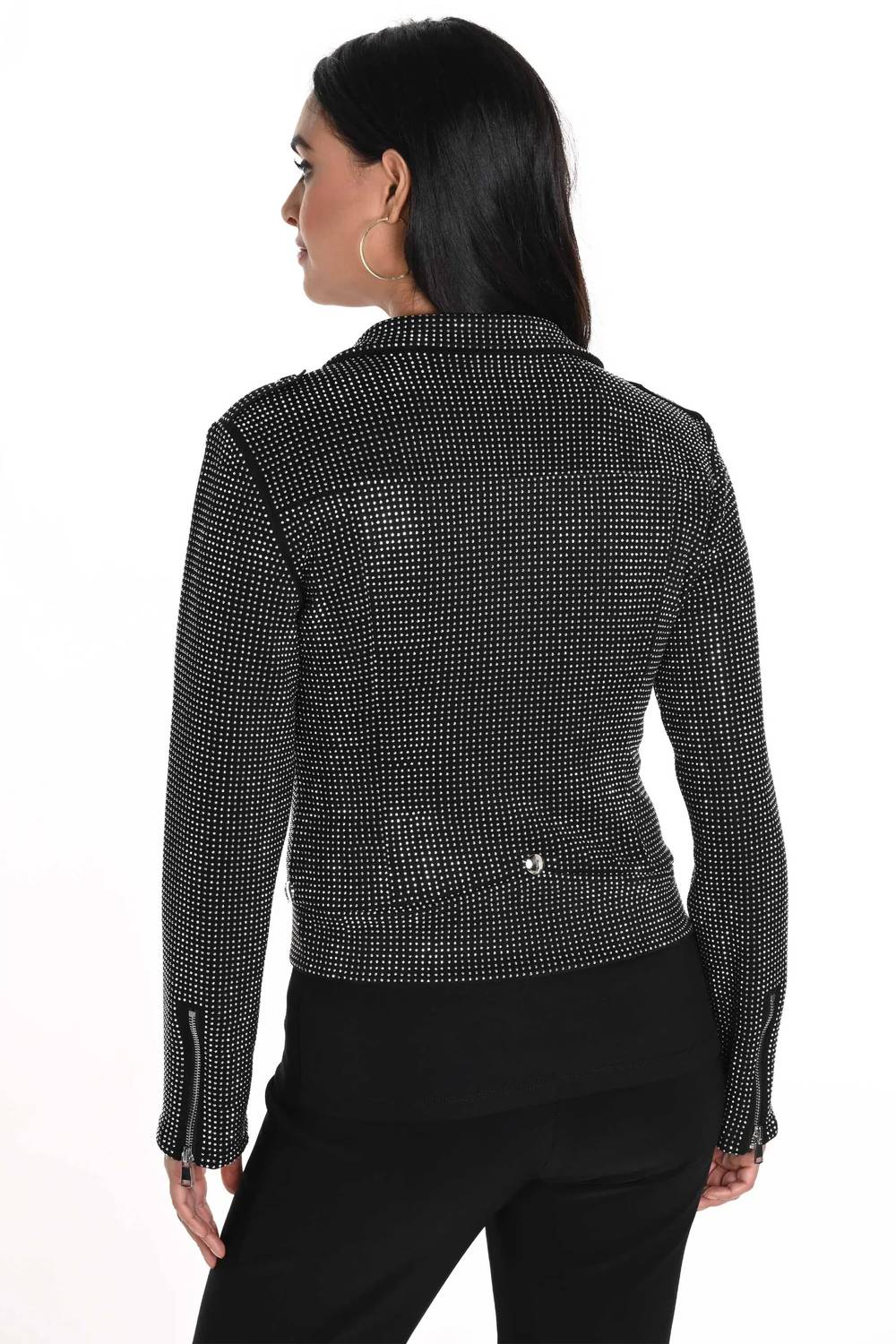 Tailored to perfection, this blazer will be your go-to jacket for years to come. Meet the Frank Lyman Rhinestone Knit Jacket, a bold expression of style in a stunning black and silver combination. With long sleeves and a classic collar, this luxurious jacket is crafted from 92% Polyester and 8% Elastane. The design features a zip closure for easy wear, complemented by moto-bike style front zips and zip pockets, plus chic stud details. Ideal for elevating concert looks or celebrating New Year's Eve, its attention to detail is perfect for those who value craftsmanship and flair.