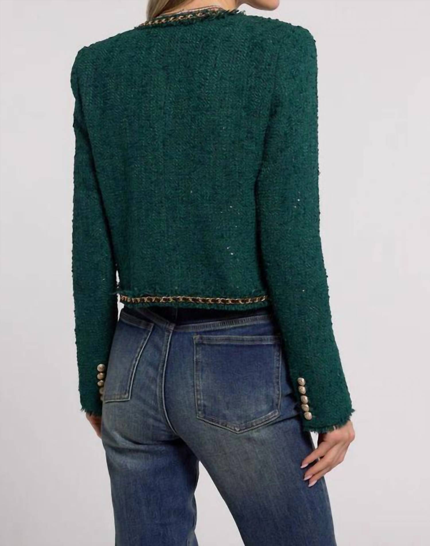 Tailored to perfection, this blazer will be your go-to jacket for years to come. Add a pop of color to your wardrobe with the Serena Chain Tweed Blazer from Generation Love, designed in a vibrant forest hue. This patterned blazer features long sleeves and a crewneck, made from a self 100% polyester fabric with a 95% polyester, 5% elastane lining. Measuring 19.5 inches in length, this Y2K-inspired piece has a regular fit and comes with a practical pull-on closure. Perfect for a holiday party look, it's fully lined and needs professional dry cleaning to maintain its festive allure.