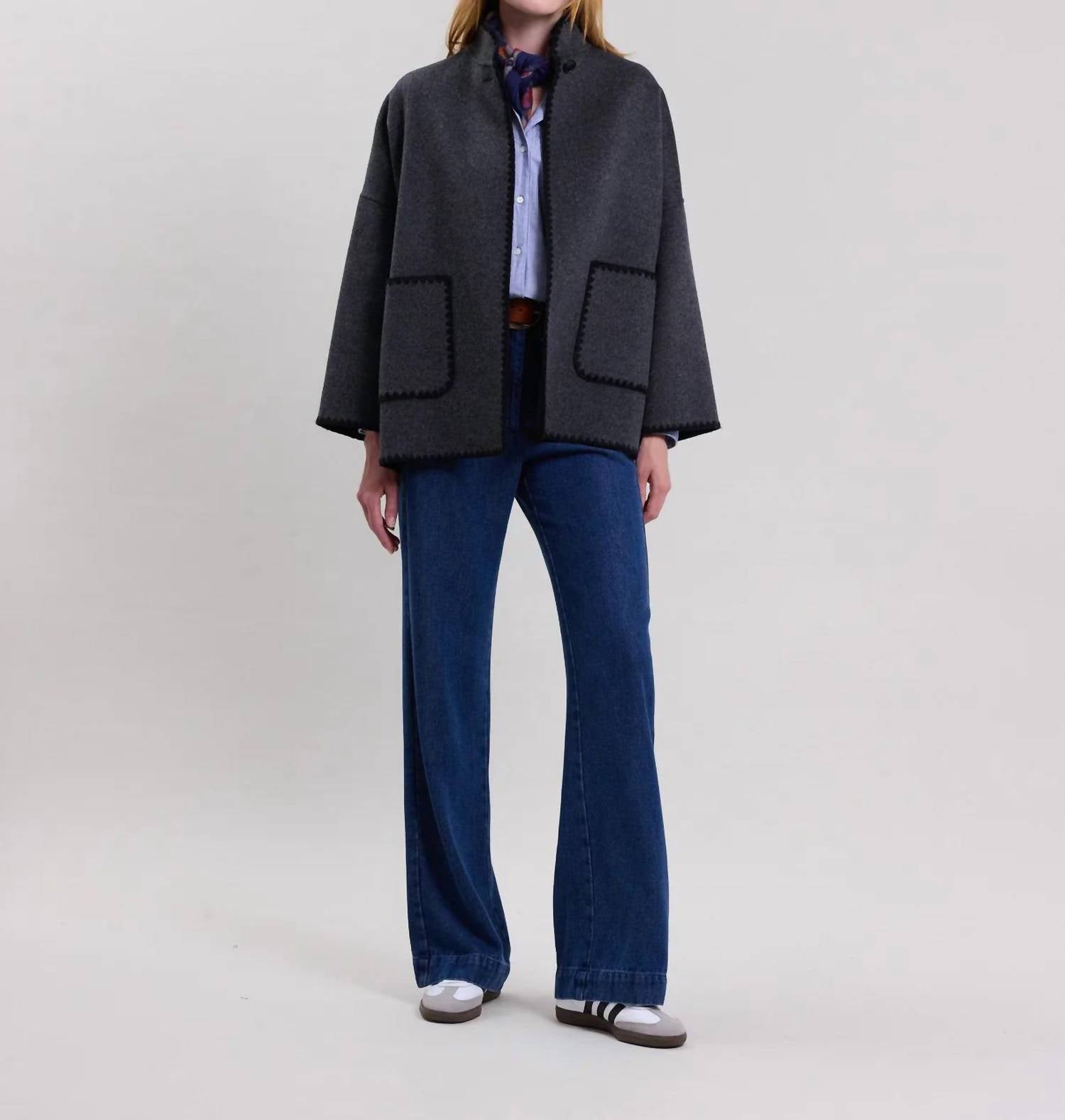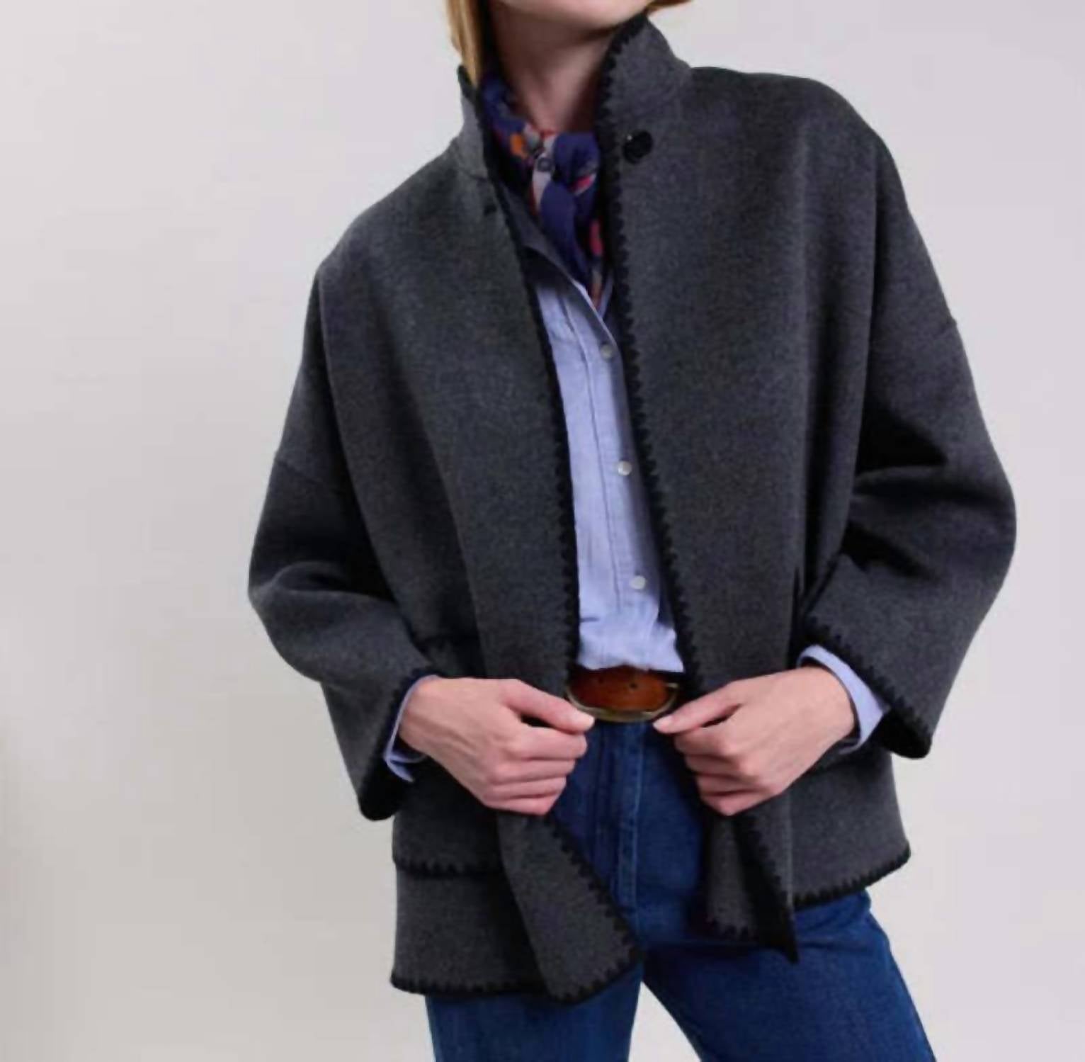 A jacket so versatile you can literally wear it with anything. Discover the Valentine Woven Coat by Hartford, a chic choice for your autumn wardrobe in a sophisticated anthracite color. This loose, cape-inspired women's jacket features long sleeves and a high mandarin collar, accentuated by a button at the double-faced wool collar. Crafted from a luxurious wool blend, it includes dropped armholes and two patch pockets for added functionality. Made in China, this solid pattern coat is perfect for a monochrome look during Thanksgiving or any vacation occasion.
