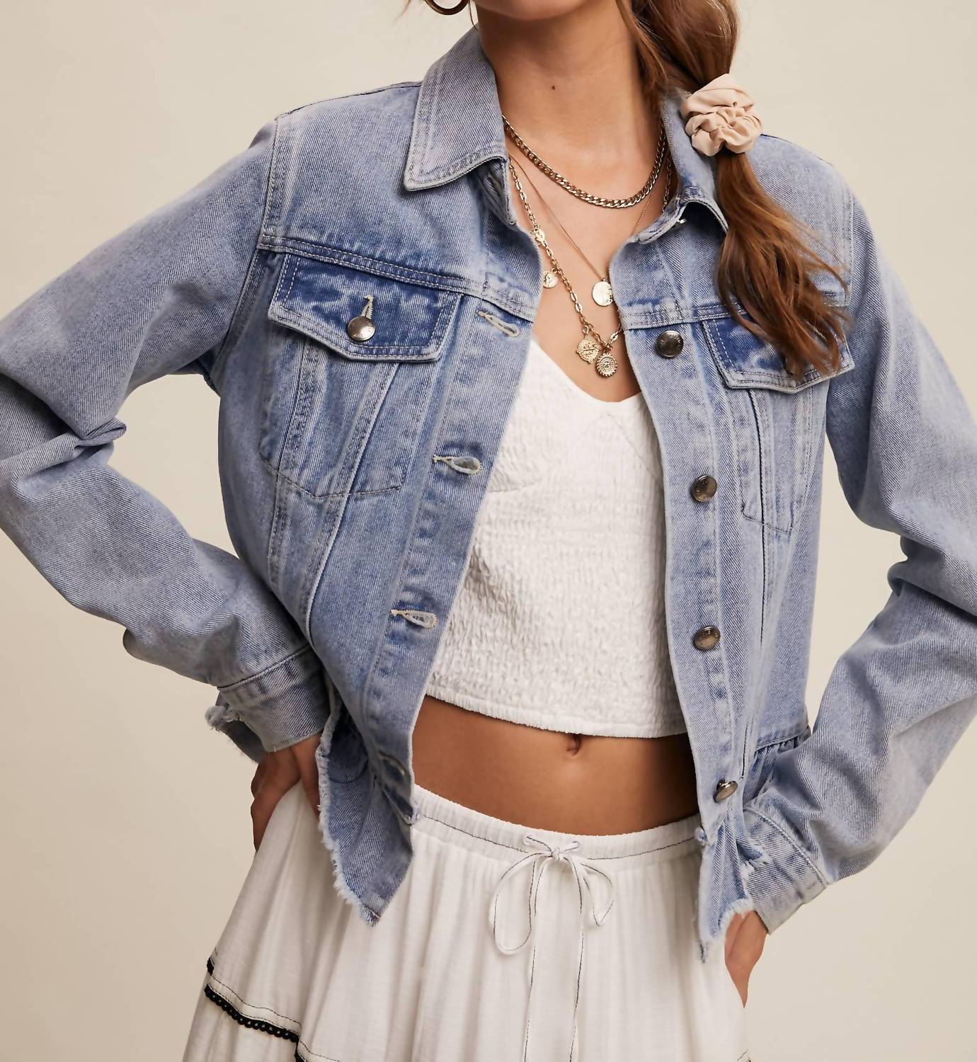 Throw this adorable jacket over just about anything for an effortlessly stylish look. Embrace a feminine twist on a classic with the Ruffled Hem Denim Jacket by Listicle in Light Denim. This solid-pattern jacket features long sleeves with adjustable buttoned cuffs, crafted from soft, faded denim with a vintage-inspired wash. Its classic collared neckline complements the playful ruffled hem and functional chest flap pockets, all secured with a sturdy button closure. Ideal for layering, this unlined piece offers a stylish, comfortable option for any spring wardrobe. Model is 5' 7.5" with measurements 33-24-34, wearing a size Small.