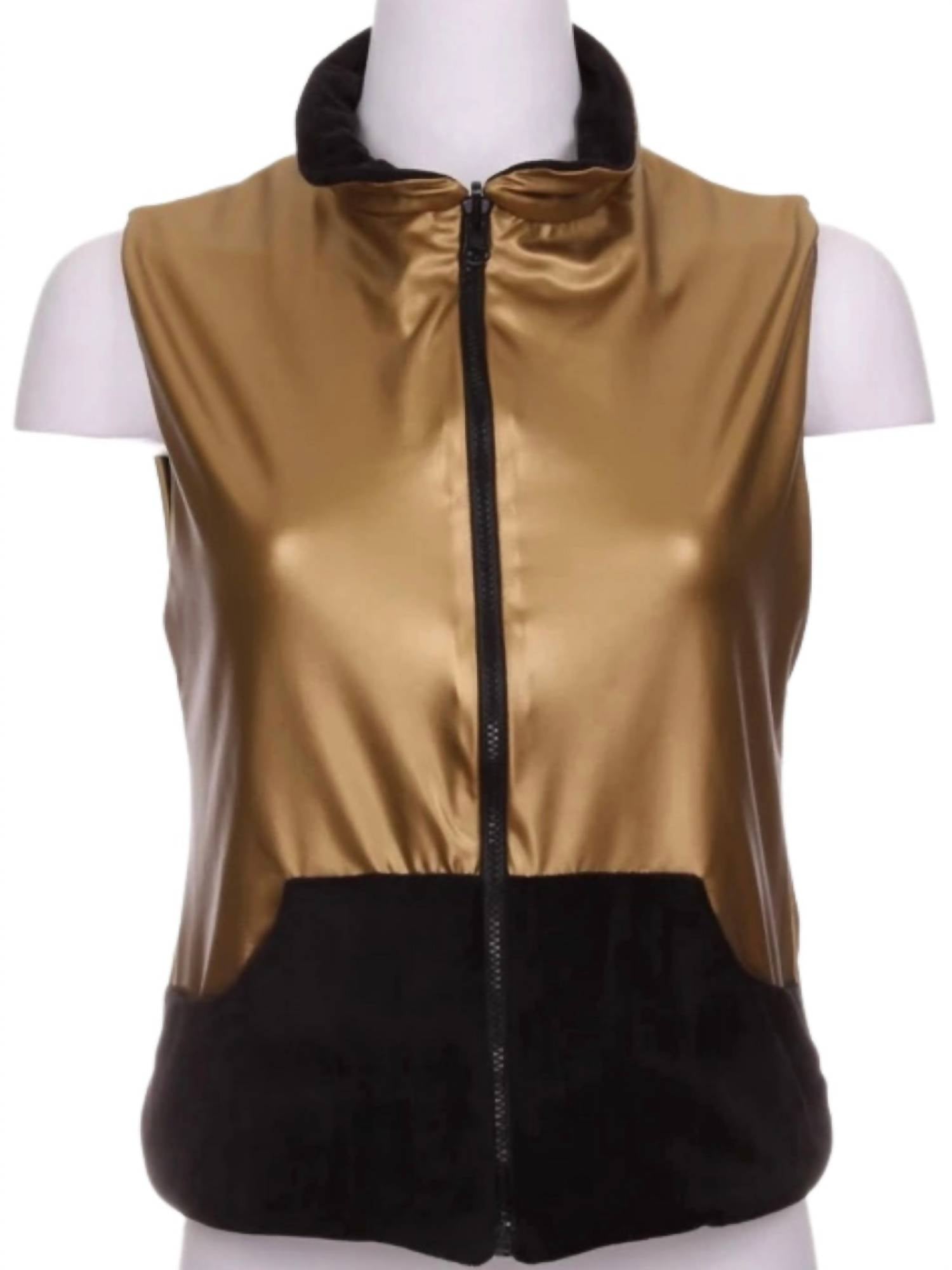 Throw this vest over an all black outfit for a perfectly polished look. Elevate your game day look with the Women's Reversible Vest by Love Love Tennis, featuring a chic black and gold design perfect for athleisure enthusiasts. This sleeveless vest, crafted in a solid pattern, offers the convenience of pockets on both sides for your tennis essentials. With a practical zip closure and a stylish mockneck, it effortlessly complements a sporty yet polished outfit. Made with easy care in mind, simply machine wash cold and line dry for hassle-free maintenance.