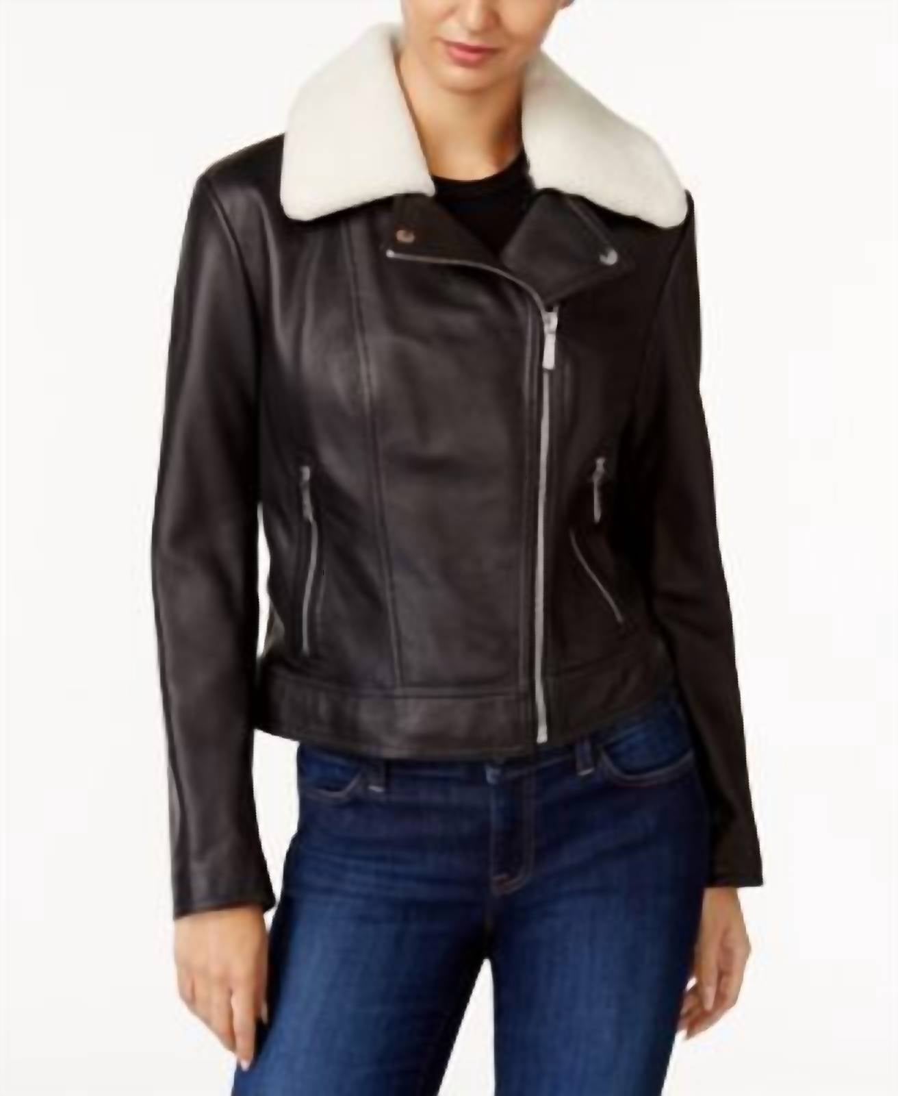 A leather jacket so good, it works with just about any outfit. Edgy fashion moto leather jacket featuring a zip out shearling collar. 100% Genuine Leather. Zip front closure. Professional dry clean.