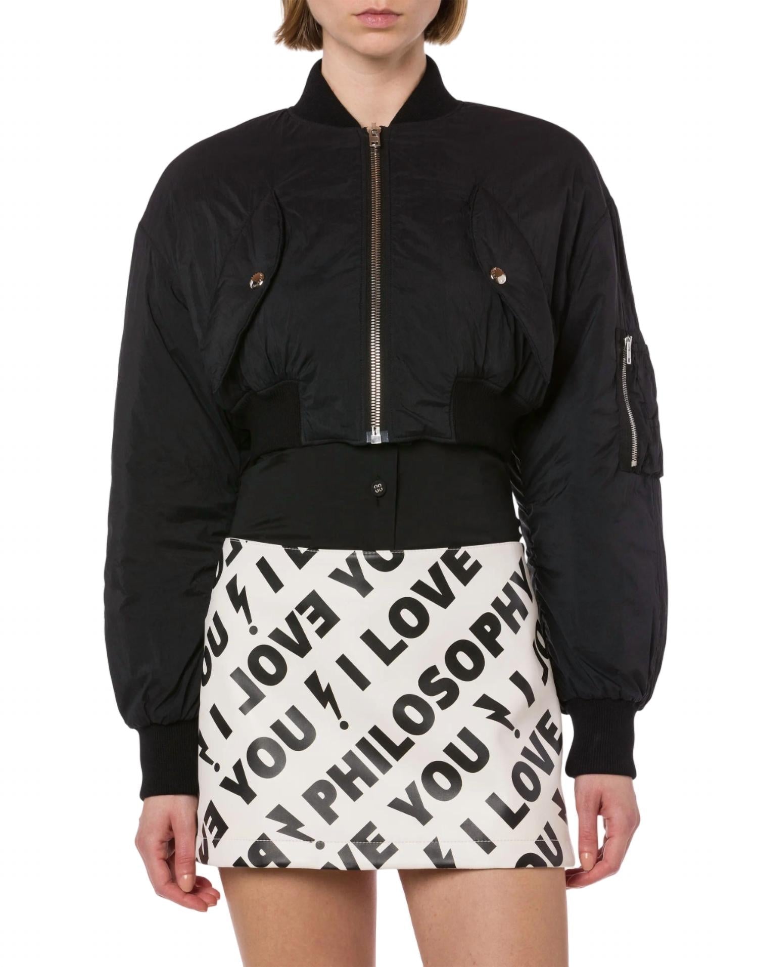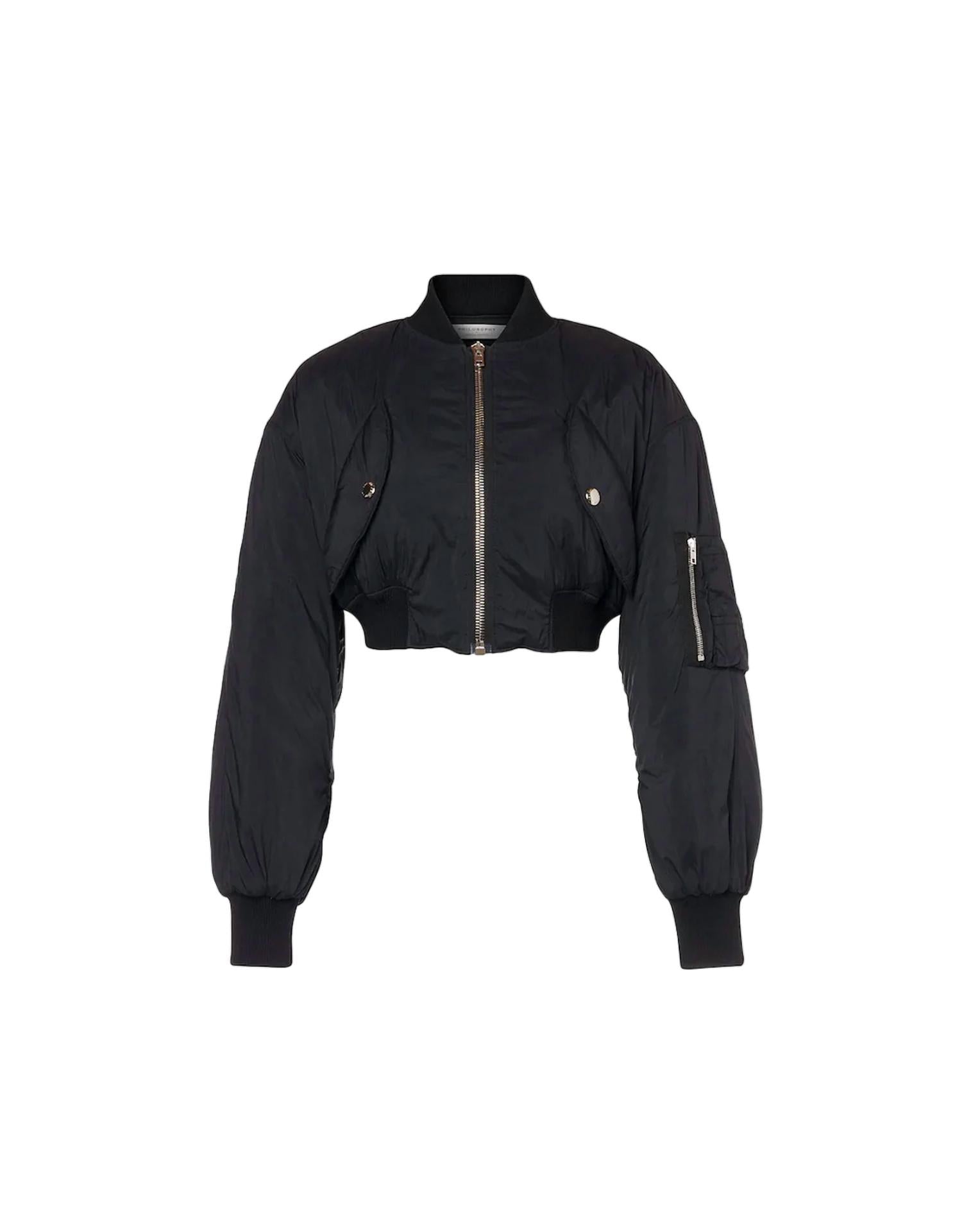 Nothing is cooler than this vintage inspired bomber jacket.100% Polyester, 100% Polyamide. Padded nylon crop bomber jacket with front pockets and small sleeve pocket. Made in Italy.