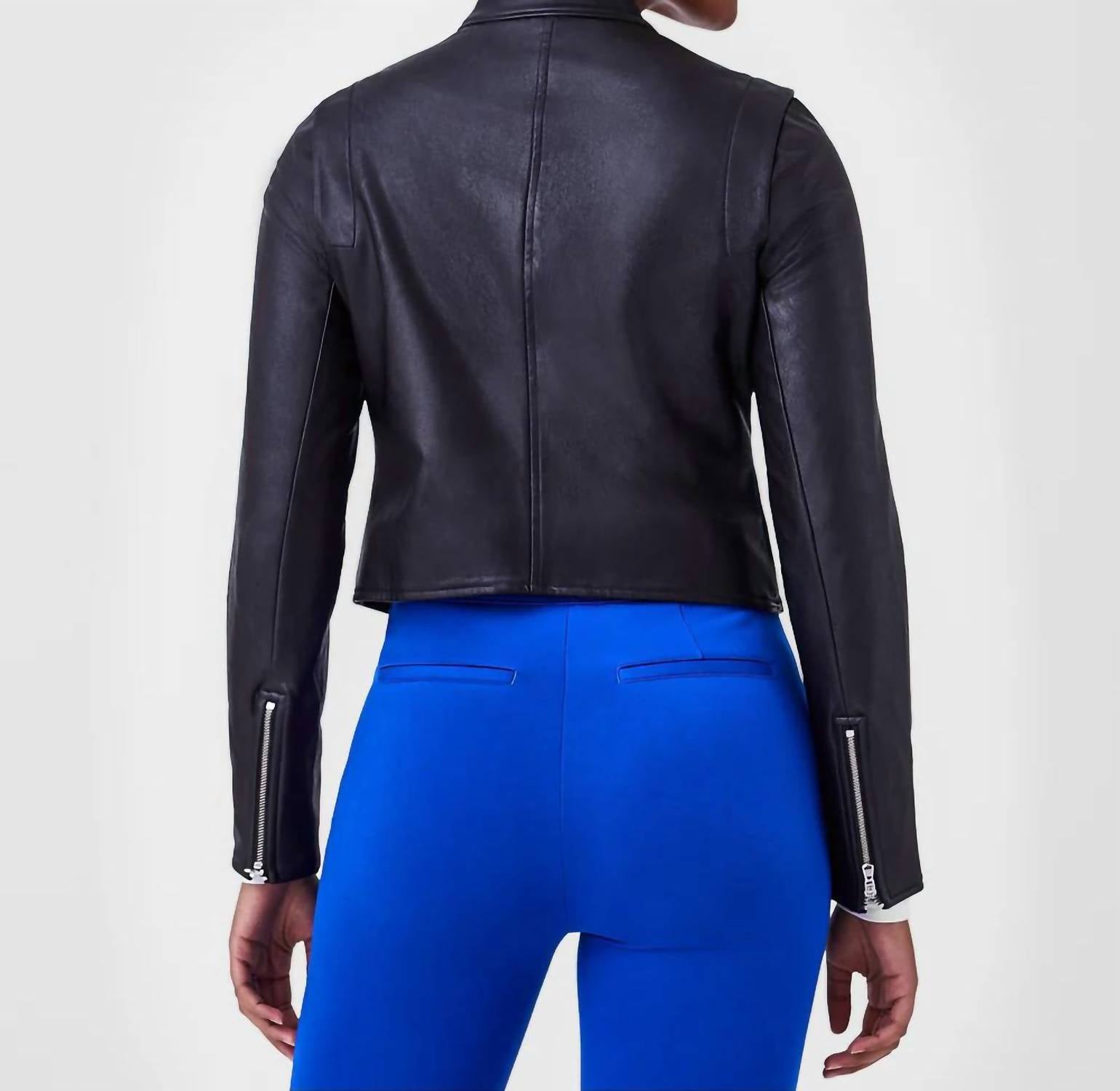 Soft leather, impeccable design. This leather jacket is a win-win. Edgy style meets all-day comfort. Features long sleeves and a crewneck design. Crafted from a blend that includes 92% Polyester and 8% Elastane with a Polyurethane coating. Offering a leather appearance with fabric flexibility. Hip-length and lined for added warmth. Offers functional pockets and zippers at the sleeves for practicality and style. With a zip closure for secure fit. Easy to care for with a machine wash on a gentle cycle.