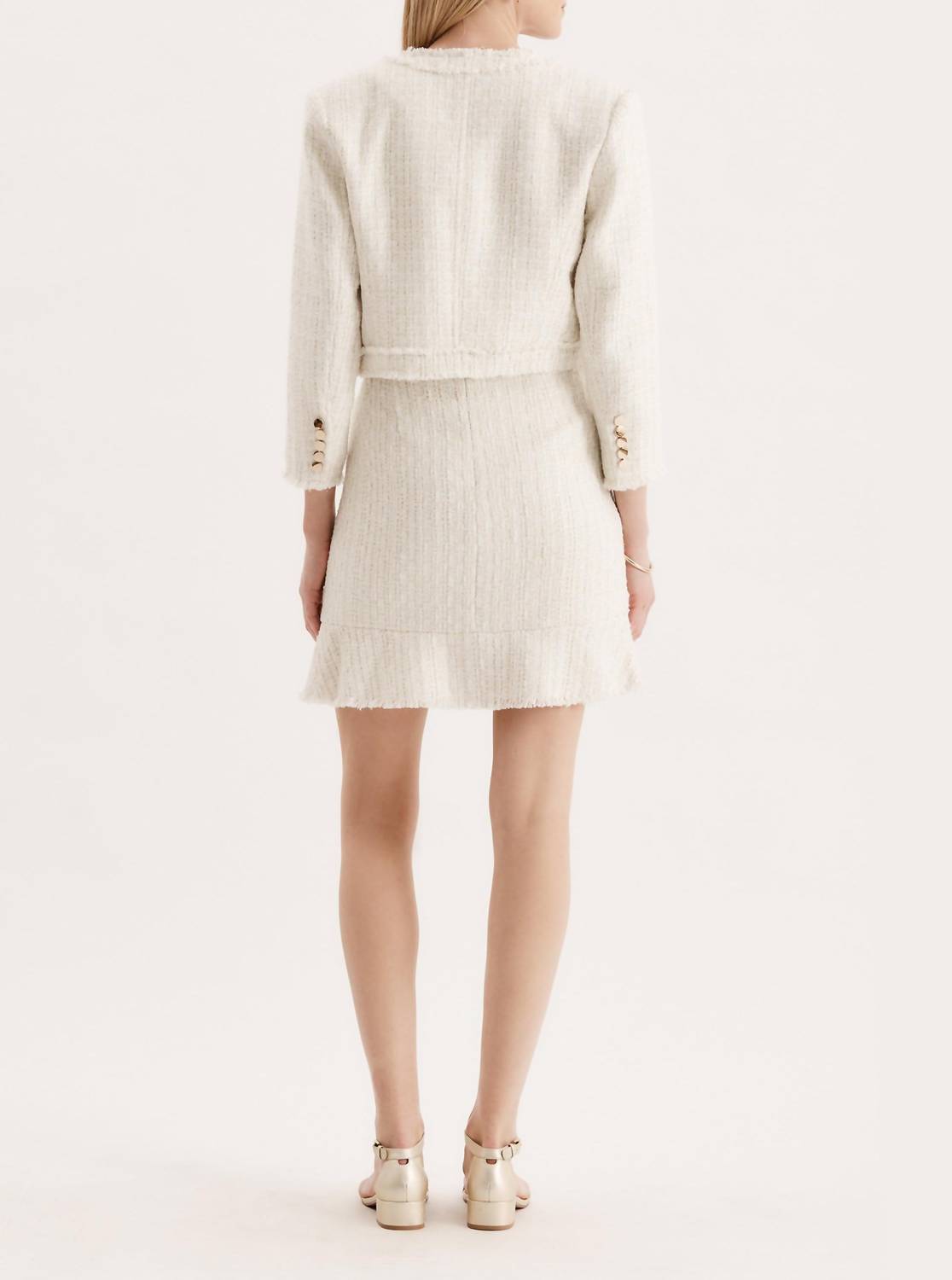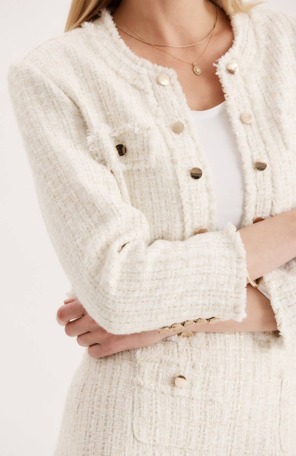 An elevated version of your favorite classic blazer. Introducing the Jackie Boucle Jacket by Tyler Boe, a sophisticated piece for your wardrobe. This ivory jacket is crafted from textured polyester and designed with long sleeves and a chic crewneck. The luxurious boucle fabric and elegant gold buttons elevate its look, making it perfect for a dinner party or workwear. Complete with functional pockets, this jacket is effortless to maintain with dry clean care instructions.