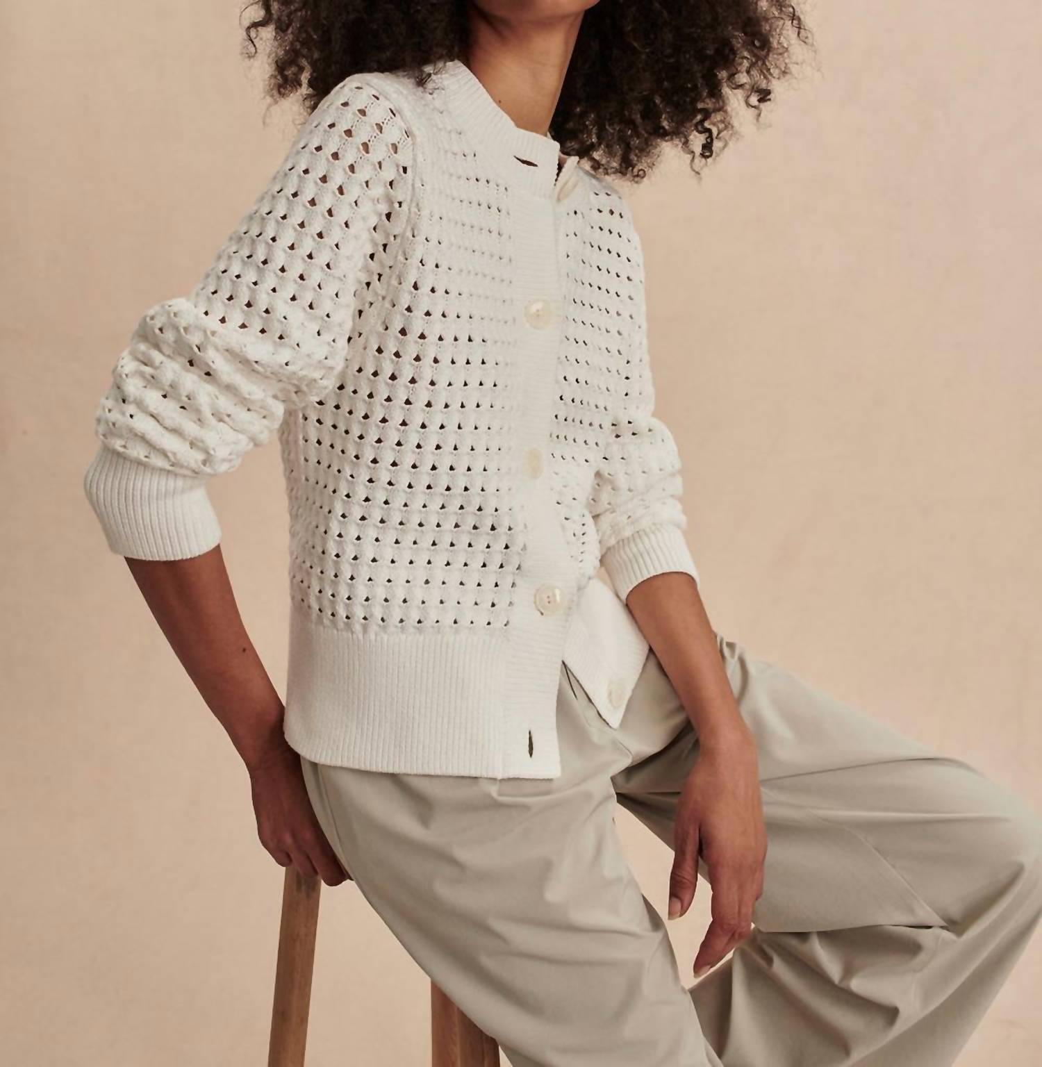 The Bettina Textured Knit Jacket by VARLEY in Snow White offers a stylish blend of comfort and elegance with its long sleeves and 60% Cotton, 40% Polyester construction. This casual jacket features an intriguing textured pattern using cotton poly tube yarn in a twist cable stitch with open pointelle top layers for added texture. The design is completed with a classic crewneck and practical button closure. Care for this piece easily with machine washing, followed by laying flat to dry, ensuring it remains a preppy and chic choice for fall travel and Thanksgiving gatherings.