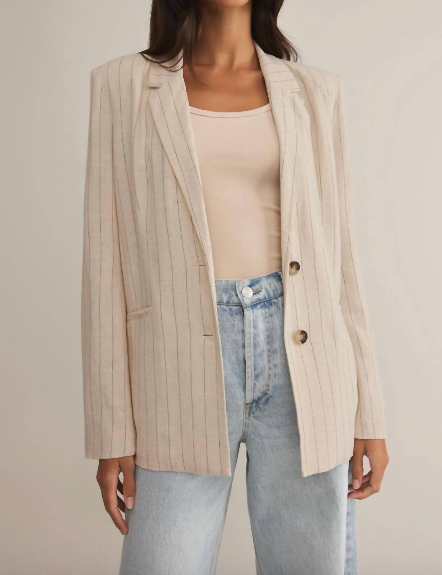 A blazer so versatile you can wear it to the office or pair it with jeans for a more casual look. Elevate your workwear with the Livingston Pinstripe Blazer by Z Supply, tailored for women who appreciate refined style. Crafted with long sleeves and a classic collar, this relaxed fit blazer boasts a button front closure and convenient welt pocket, adding functional flair. Made from a textured blend of 80% Viscose and 20% Linen, it offers a midweight feel with a heavy soft wash, ensuring comfort throughout the fall season. Embrace the flax-colored pinstripe pattern for sophisticated occasions like Thanksgiving dinners.