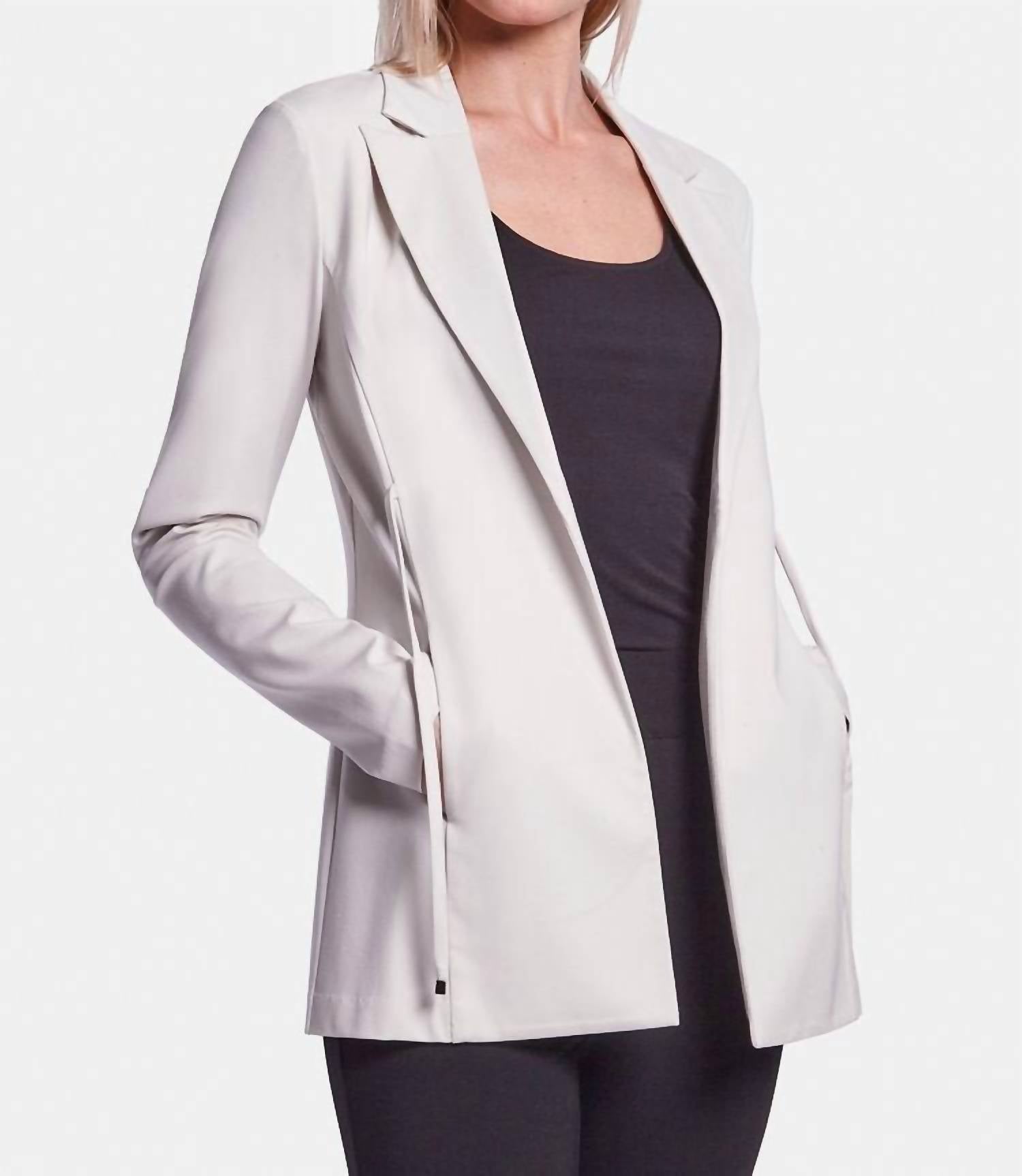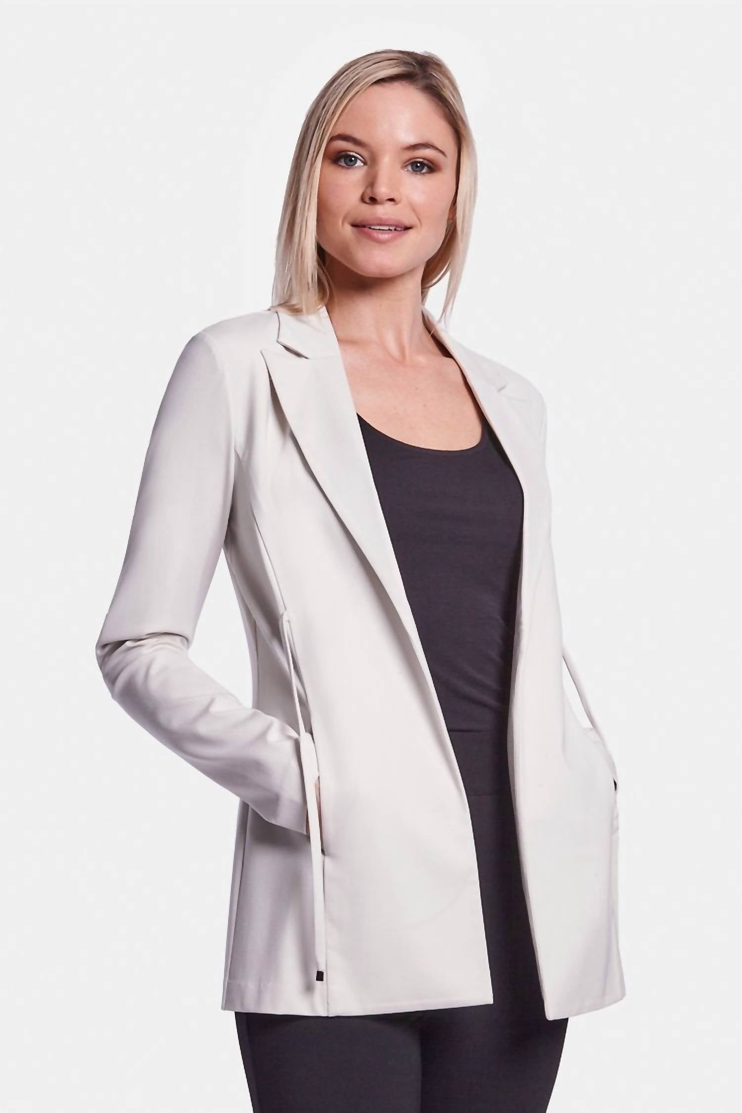 Side pocket details. Blazer Fit Type - Active Fit. Model is 5'9.5" and wearing size small. 48% Nylon, 42 % Viscose, 10% Spandex. Machine Wash Cold, Do Not Bleach, Lay Flat To Dry, Cool Iron If Needed, Or Dry Clean. Imported. Wearable stretch construction. Notch lapels. Long sleeves. Drawstring waist. About 28" from shoulder to hem.