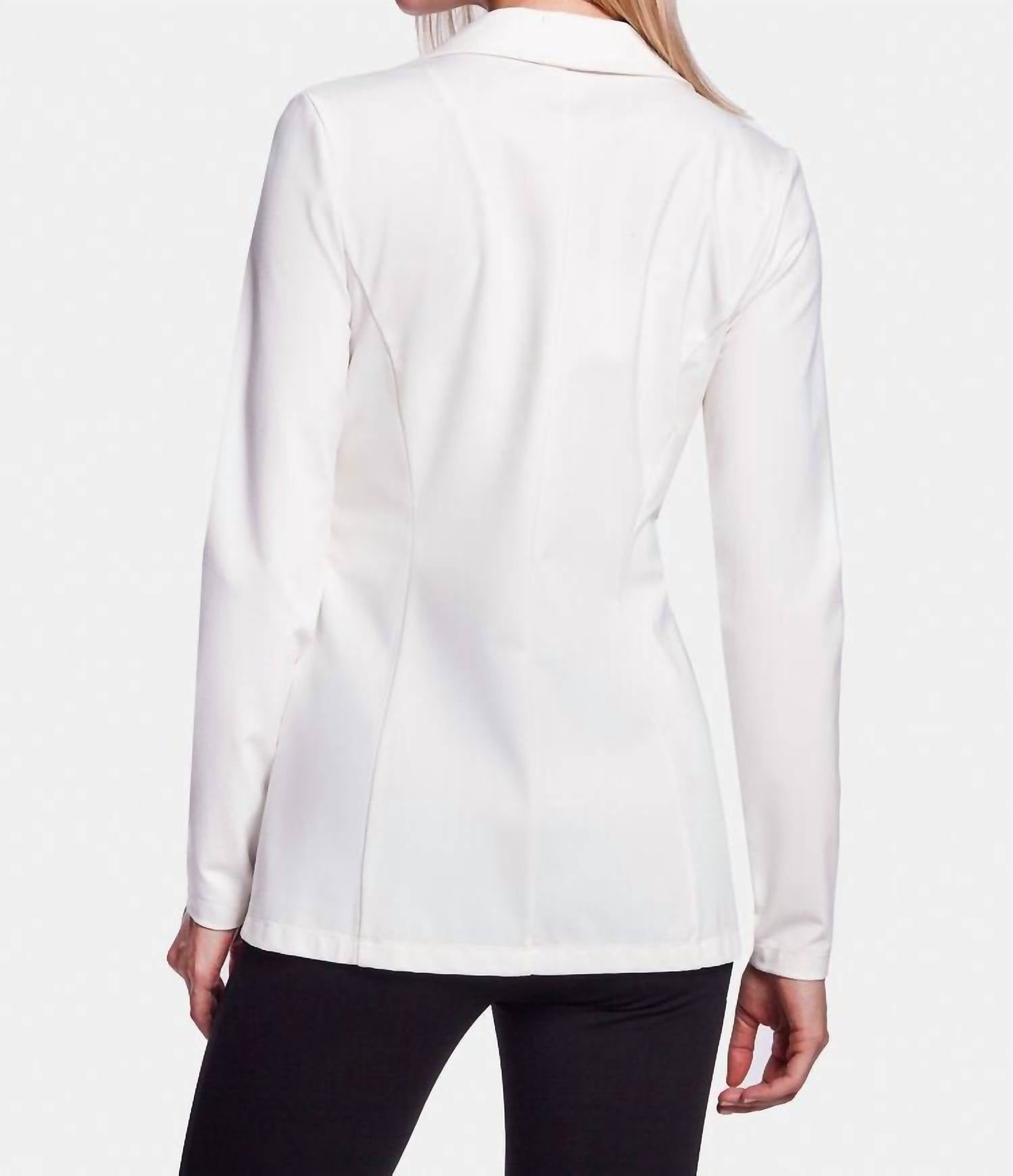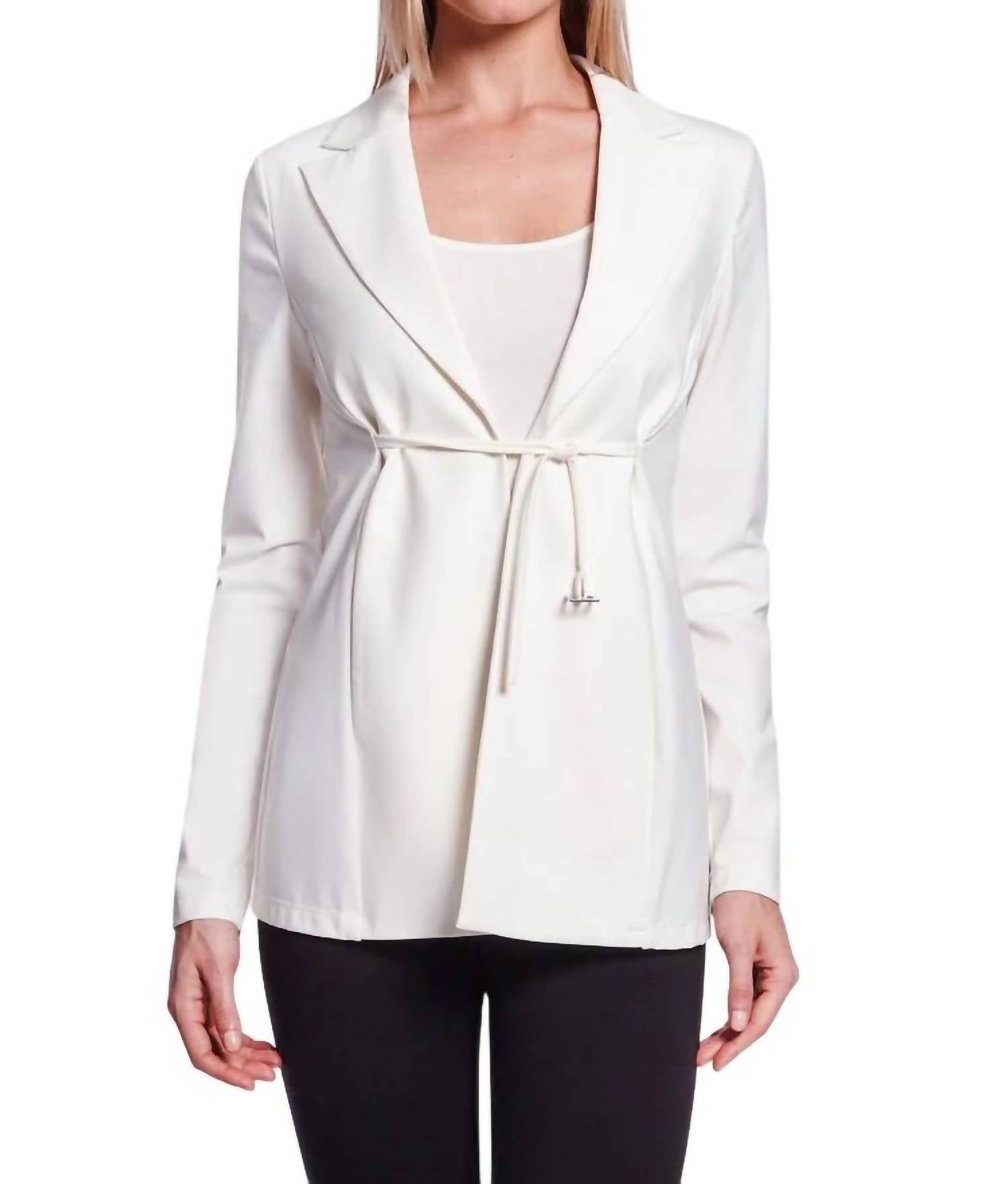 Side pocket details. Blazer Fit Type - Active Fit. Model is 5'9.5" and wearing size small. 48% Nylon, 42 % Viscose, 10% Spandex. Machine Wash Cold, Do Not Bleach, Lay Flat To Dry, Cool Iron If Needed, Or Dry Clean. Imported. Wearable stretch construction. Notch lapels. Long sleeves. Drawstring waist. About 28" from shoulder to hem.