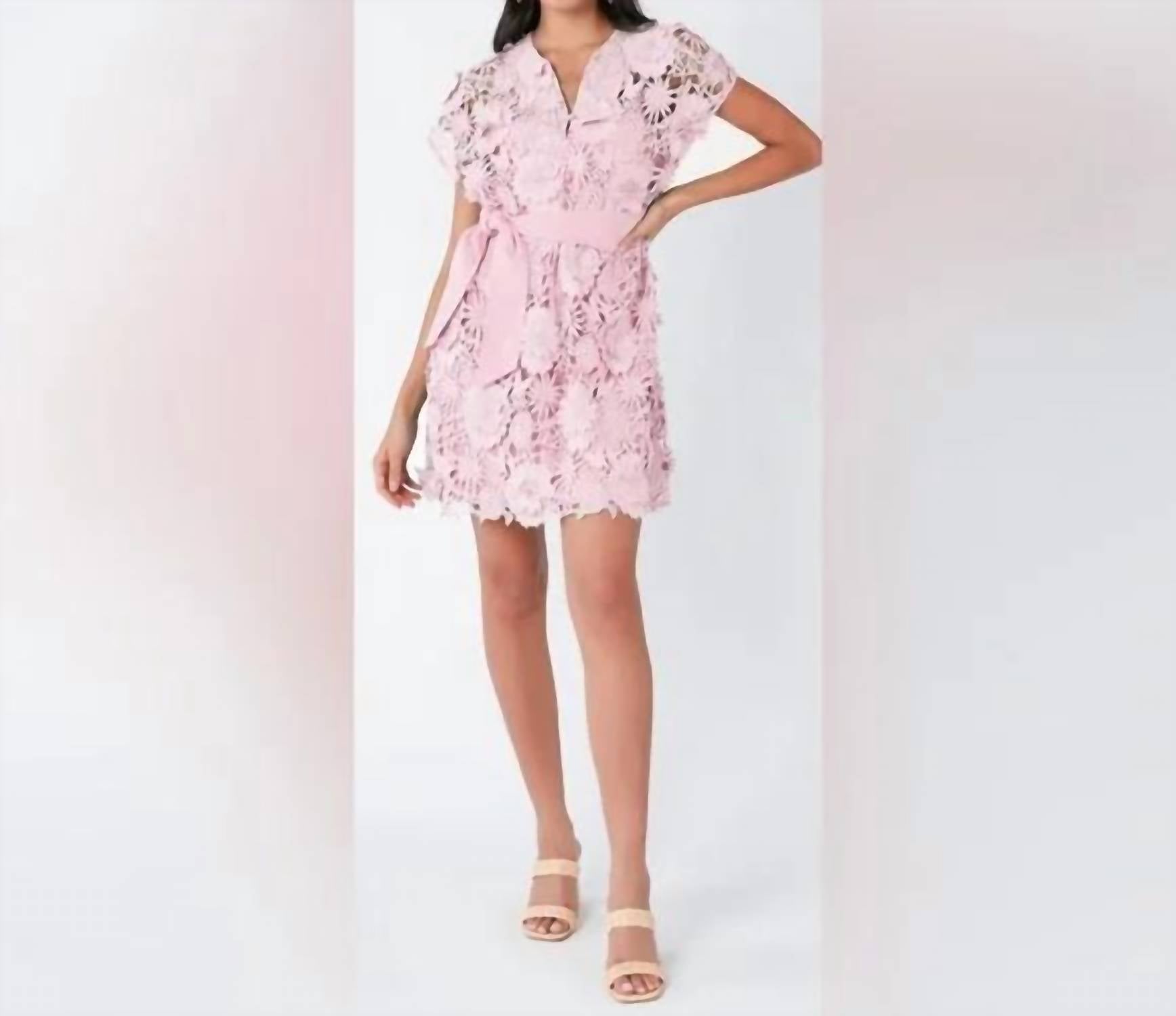 Embrace summer elegance with the Vera 3D Lace Kaftan Mini Dress by ABBEY GLASS, a chic option for evening events. This women's mini dress comes in a playful pink floral pattern, featuring a cap sleeve and a matching slip for added coverage. The piece boasts a V-neckline and a removable belt for customizable style, secured with a button closure. Ideal for evening events, its generous fit ensures comfort without compromising on quiet luxury trends.